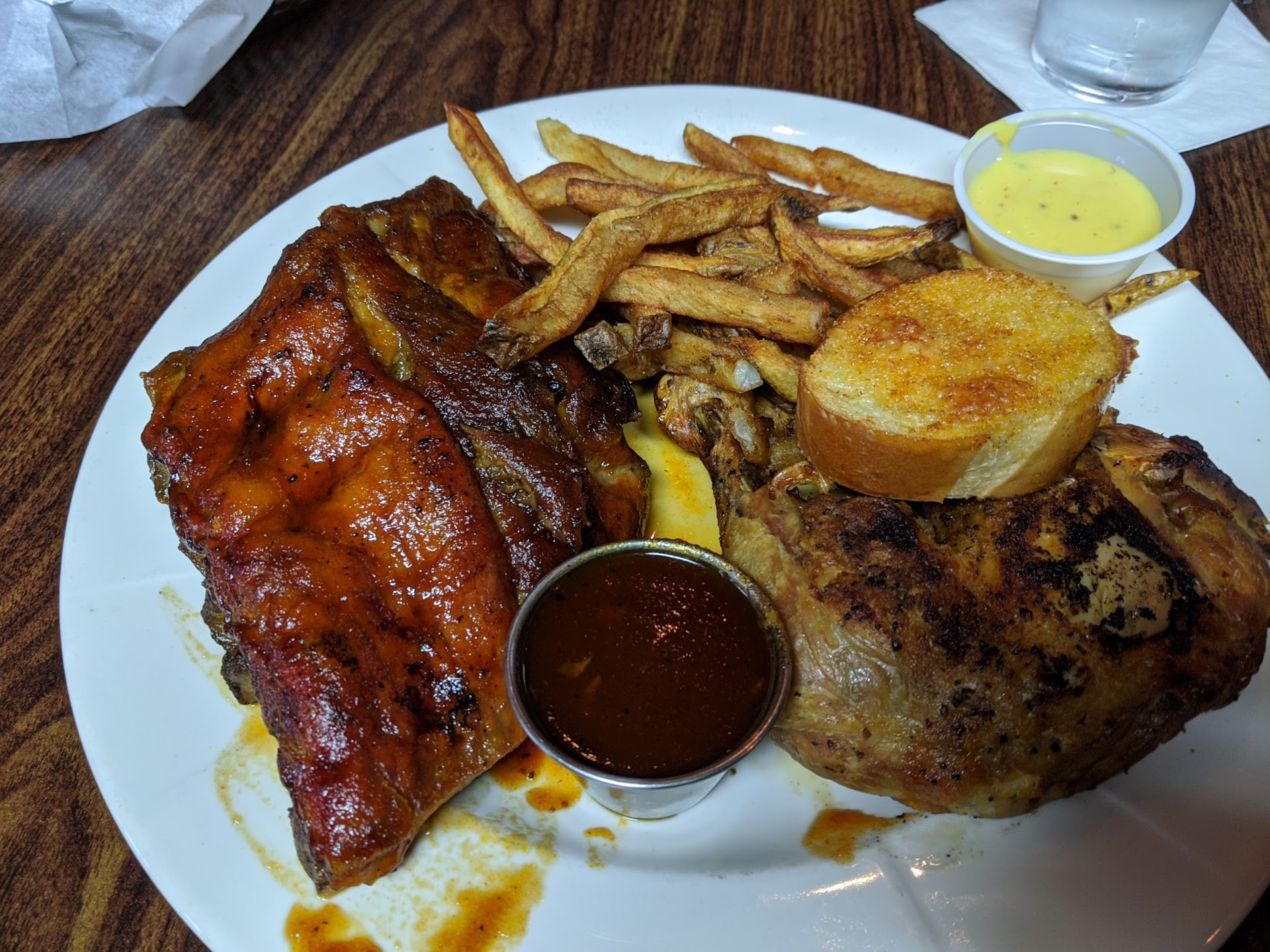 We arrived around 6 for supper. Sign said best ribs in town. 1st time there, and as we walked in, we were unsure what to do. Finally, we were directed to sit wherever. The place isn't really big and I could see 3 servers and a bar tender. We sat away from the bar. Our server was overly perky and very slow. Someone else ended up helping us so we could leave. The atmosphere was very loud and they were not full. Lots of food. Ribs were dry and just ok. Little garlic breads were flavorful. French fries were slim, hand cut, and crispy. 1/2 slab of ribs was 4 bones for $18, and full was 8 bones for $32. Mine seemed bigger than that but not a lot of meat. There is definitely a lot of food. To recap, poor server, loud environment, large servings, food came in appropriate time (which told me not kitchen issue). Tried once. Probably...