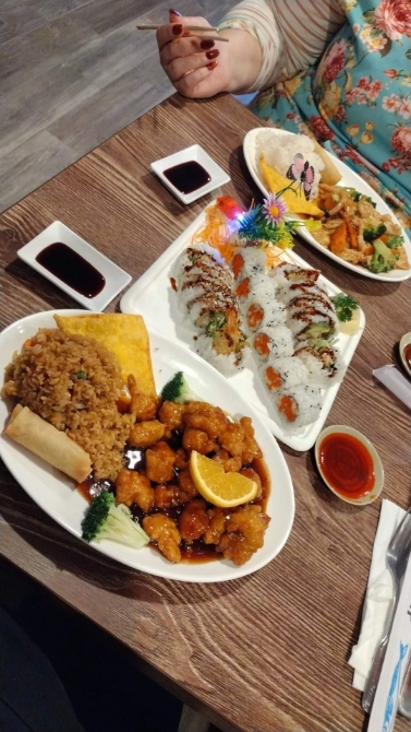 I see there are many good reviews here, so maybe this place is just not our cup of tea, or we tried it at a bad time. We had an appetizer of the tempera shrimp and vegetables, and they were crunchy and fun but mostly bland. The chinese food (Happy Family) was prepared with a decent texture but not a lot of flavor... and the flavor that it did have was very sweet. The sushi... well... we ate it, but the texture was off, and again, the flavor was too sweet. We expected the sweetness lingering on the eel in the Unagi Don (which wasn't too bad), but the spicy salmon wasn't spicy at all, and the pasty texture of the salmon was way off. Kinda scary off, tbh. The presentation wasn't too bad, but I didn't take a picture. The ginger salad was pretty good, and the pickled ginger was great, but the Wasabi was bright green and didn't taste like regular Wasabi... which I know isn't the actual real Wasabi in America, but this one actually looked fake. The place was cute, though. My son did make the comment about the open umbrellas hanging from the ceiling because some people say that's bad luck to open umbrellas inside. I hope my review doesn't hurt them but still informs others if they have...