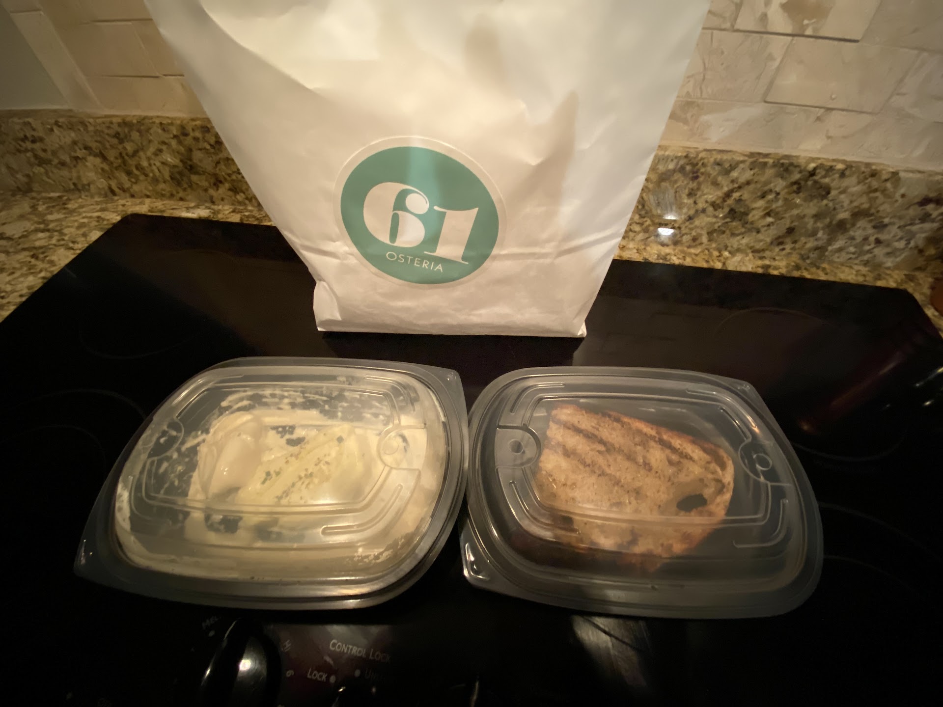 Entrees arrived sans the cacio e Pepe I ordered. The server came and apologized stating it was on the way. Nearly done with the other part of my meal, and after the server walked past our table a couple of times without acknowledgment, I called her over and told her to cancel the cacio e Pepe. A few minutes later, she brought pasta anyway stating it was on the house and said she she could pack it to go because “it was so good she wanted me to try it”. Deflated and ready to go home I agreed; however, I should have checked my bag before leaving. SEE PHOTO of the mozzarella and bread I got instead of the cacio e Pepe. #really?