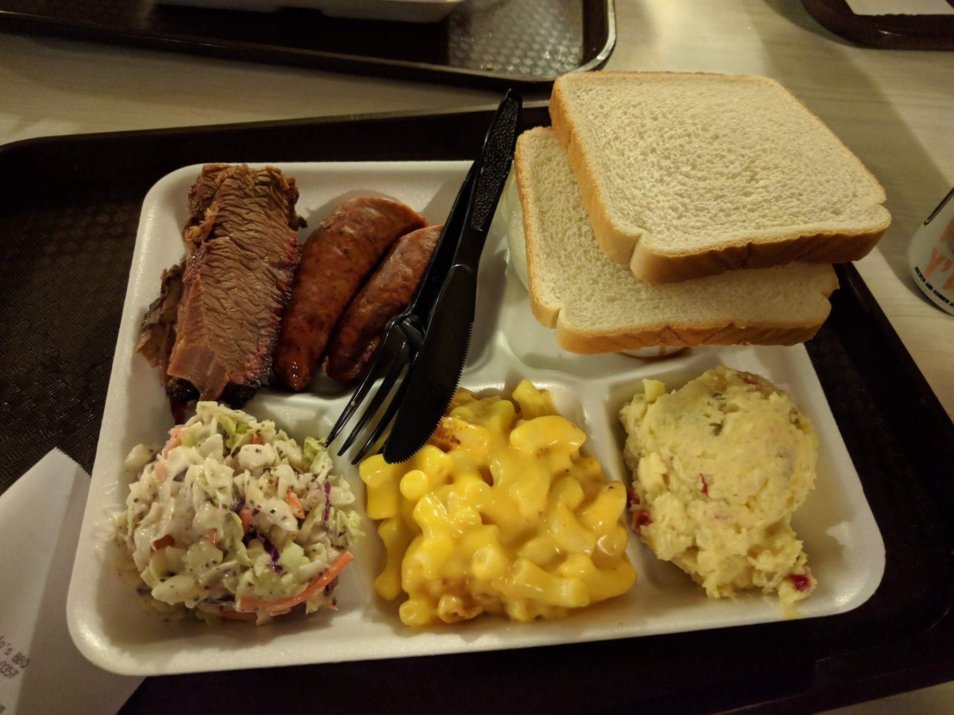 The sauce does exactly what sauce is supposed to do, it elevates the meal. I have had plenty of 4 star BBQ that wound up as 3 star BBQ as a result of sauce. The sauce is given to you in a small styrofoam cup separate from your barbecue, it is worth it's designation of precious cargo, as if it is some medical grade flavor to empower your meats to leap over tall buildings in a single bound. Once the smoky and spiced sauce reaches your palette you will find yourself furiously dipping and making bread, onion sausage bites and trying a multitude of combinations. The sauce takes this barbecue into the stratosphere and will have you up there for quite some time after.