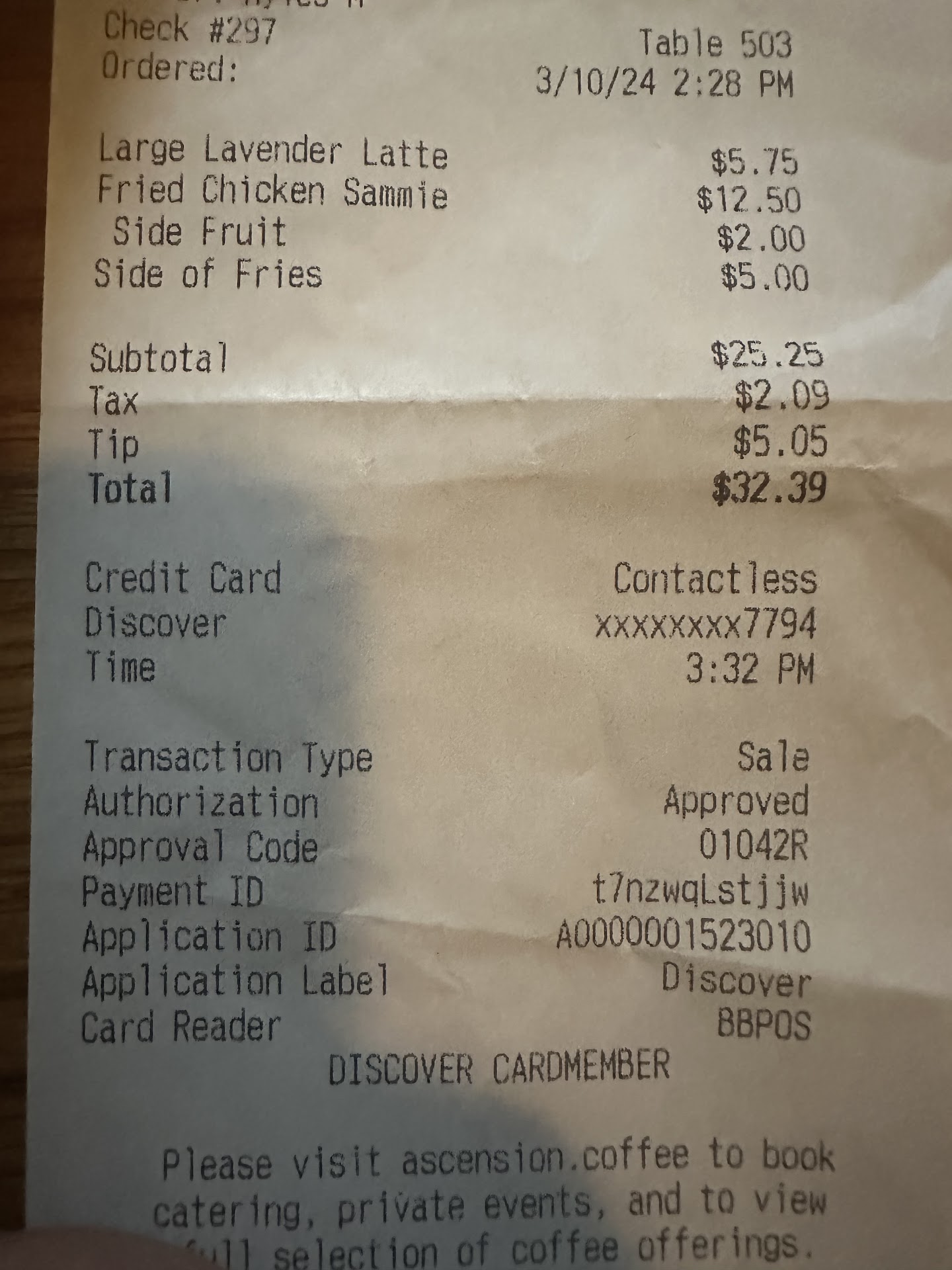 Took a while to get service, the server was genuinely pleasant though. I ordered a Lavander Latte that came out after people who I was there beforeās food and drinks. I wanted to order a Ruben, but they were out of pastrami, so I ordered a friend chicken sandwich with fries instead. When the food came out they gave me a fruit cup instead of the fries I ordered. When I explained to the lady that I had ordered fries instead she said she would get some for me. By the time I got my fries I had already ate my entire meal and returned a muffin they gave me that I didnāt order. I felt compelled to eat the fries since they brought it out and I had waited that long. After I finished it took a while to get a bill and not only had they billed me for the fruit cup that I didnāt order, but they also billed me for the fries that were supposed to come with my meal regardless. It specifically says under sandwiches(paired with frites or a house salad). So I paid $2 extra for a dish I did not ask for at all and $5 for a side that should have already came with my meal. Because I self admittedly am not great at telling people when they messed up I reluctantly added a $5 tip. So a meal that should have been roughly $20-$24 cost me $32.39. I wish I could get my money back, but itās...