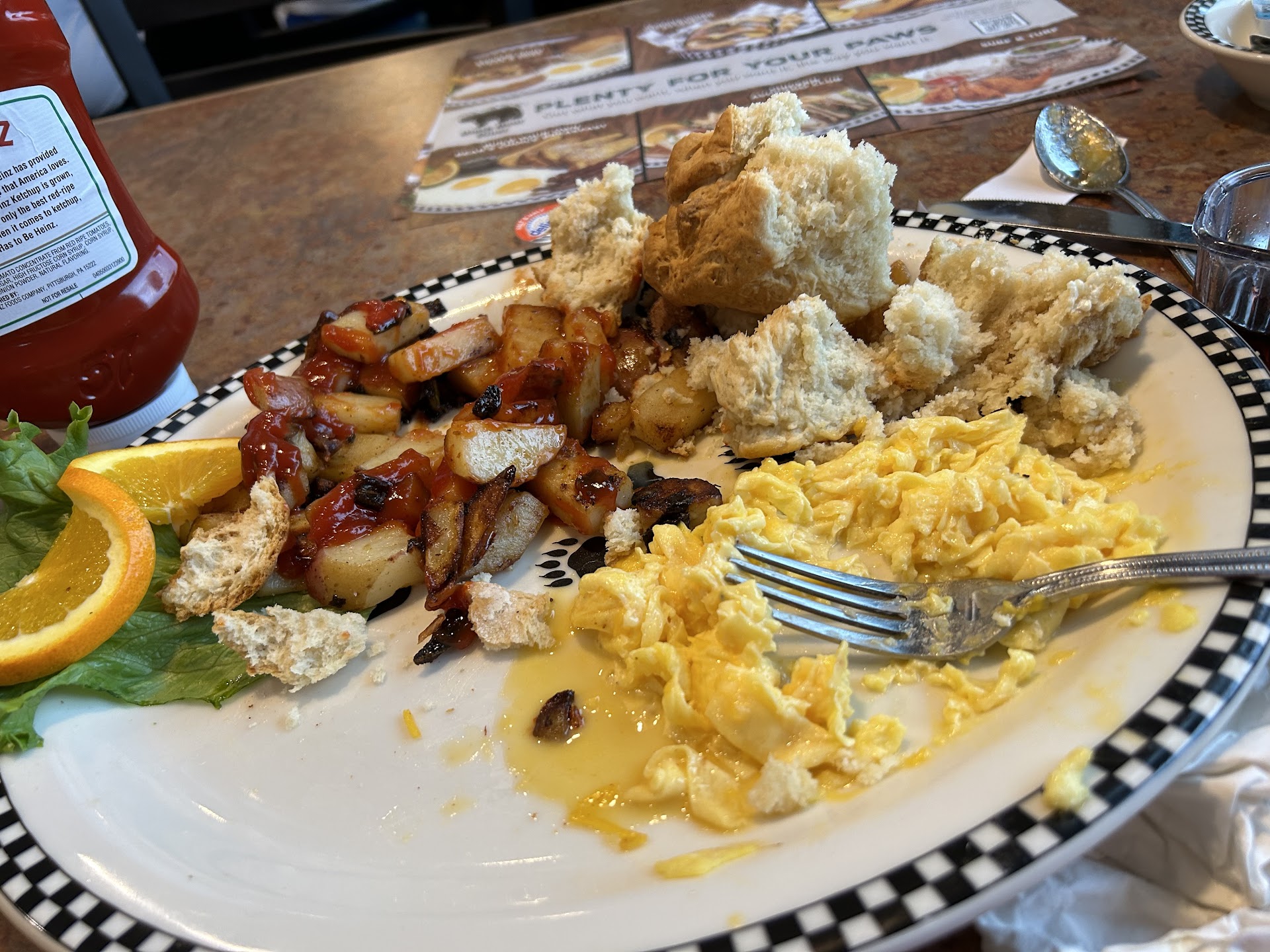 FOOD-for the Grizz, we were pretty disappointed in the size because the menu makes it sound like it is a very large meal as well stating the bacon is a thick cut. as a ham steak, which we believe that it must’ve been cut into thirds because it was not even the size of half a ham steak. The bacon was skinny, and the pancakes tasted like they were made out of a box and were very light in color. We got a fresh fruit side, which was only melon and TWO grapes. We were at least expecting a variety of melon like maybe some cantaloupe or something or some strawberries or anything than just honeydew. The turkey club was quite delicious. It was eaten on sourdough bread and the mashed potatoes and gravy were honestly really good so there wasn’t really an issue with that order.