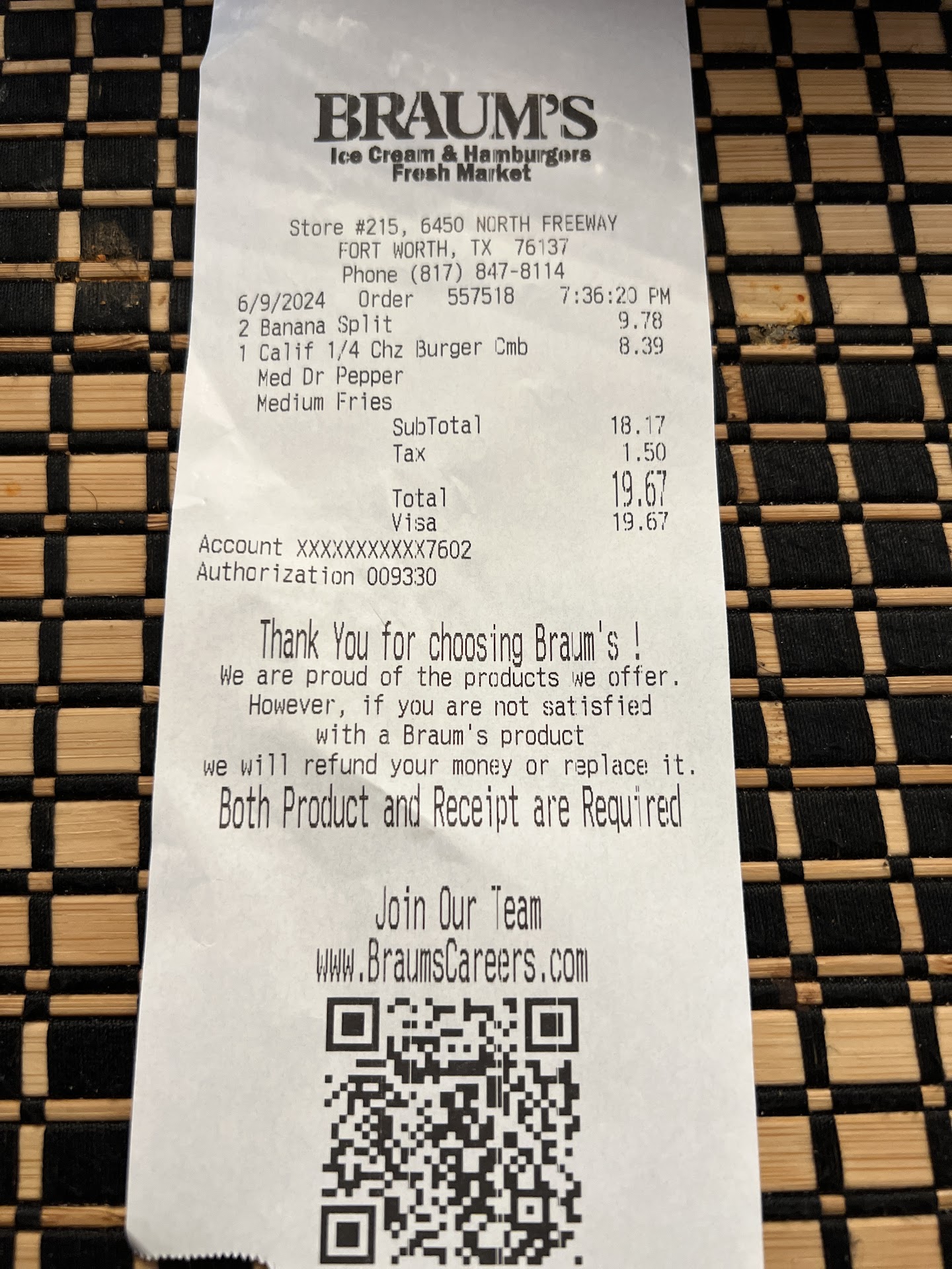 Read moreI just placed an order through the drive through and came home with part of my order missing. I ordered banana splits and a burger. I called and the person at the store explained to me that there was a second bag, i had no idea. i assumed everything came in the one bag that was given to me. When the girl handed me my bag i said “thank you” and she just turned around and closed the window. I thought it was rude, so i took my order and drove off. The explanation given was that they do not mix cold and hot items in the same bag, I don’t work there, i do not know and i dislike checking my order every time before i drive. I asked for a refund but apparently i have to drive 10 minutes back to get a refund. So now i am left upset and with no meal and i am not wasting 30 minutes extra for 9 dollars. If the girl at the windows would have said” you have a second bag” or something. What bothers me is that she just turned around and closed the window after i said thank you. Of course the explanation given to me when i called was that it is to keep the heat out and i should have known there was a second bag because when i said “thank you”, the girl said nothing and turned around. So my job is to always double check my order, even if that bother the drive through person because customers don’t trust them, and when a staff member does not acknowledge you saying thank, it means “ wait the order is incomplete” . The person that answered the phone was friendly but please do not make an excuse for your teammate’s attitude. She could have said something. And Braums should be able to process a refund over the phone, specially of the staff member knows that there was an incomplete order and i can easily email my receipt. But i was told that is not...