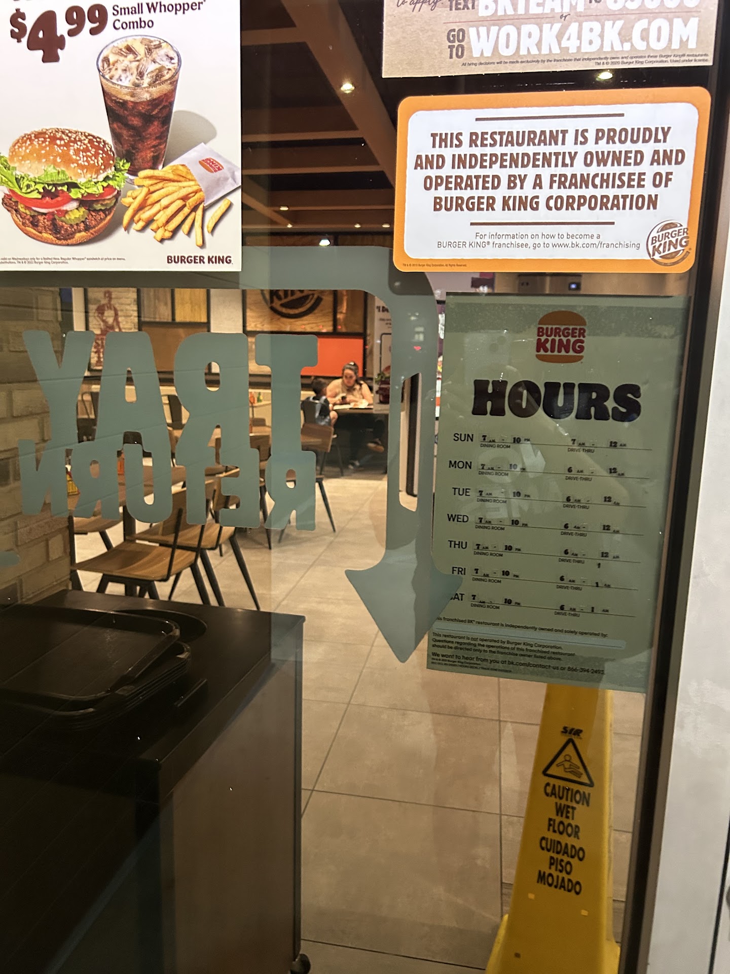 It was a normal Burger King experience. One of my favorite places to go for hamburgers. I was surprised that the service and the food was very good considering that they have just recently opened. As a matter of fact their hours of operation have been reduced from 8:00 a.m. until 8:00 p.m. so that they can properly staff to provide the full service during their normal hours. We visited there on December the 24th just after lunchtime and the service was perfect. The place was fairly crowded and there were no issues whatsoever. That's really saying something since they've just recently opened.