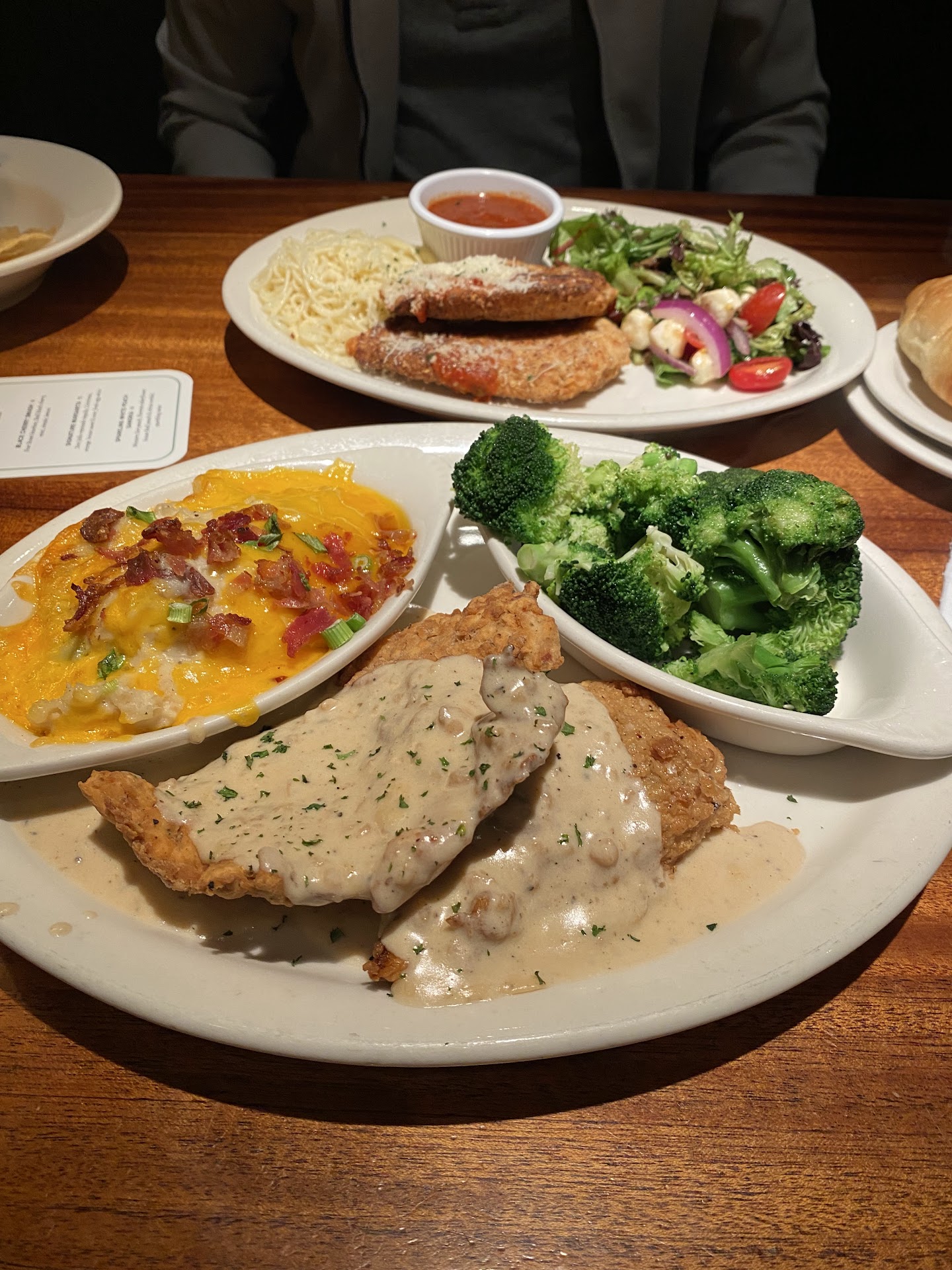 My boyfriend and I dined here last night for the very first time, Tony was our server. He was very polite and attentive, thank you Tony for your great hospitality and taking the time to guide us through the menus! With his help we ordered the croissant basket & spinach artichoke dip as starters, and for dinner the chicken fried chicken & parmesan crusted chicken. They were all very delicious, I thoroughly enjoyed the spinach dip as I never find restaurants that use actual fresh/flash frozen spinach, it’s always the canned variety and lacks flavor. It was nice and creamy, served with salsa and sour cream. For my palate I would advise not to add any sour cream to the dip since the original recipe is already perfect, we basically licked the bowl clean lol. The chicken fried chicken was super flavorful and I could taste each spice and seasoning used in the flour/batter, the gravy was subtle but a nice touch and smoothly creamy. I’m not a fan of cooked carrots so I substituted for steamed & buttered broccoli, I also opted for the up-charge to make the mashed potatoes loaded with cheese, bacon, and chives. Both sides were quite yummy :) My boyfriend really enjoyed his plate, and it comes with this small portion of fresh mozzarella salad - it includes spring greens and a vinaigrette that is extra tangy, a nice palate cleanser to his pasta dish. I also ordered the non-alcoholic vanilla blackberry punch but it just wasn’t doing it for me, I guess I’m not a huge fan of ginger beer lol. Overall a very pleasant date night, will come here again when we have the chance :) For transparency, our total after tax for everything we ordered was $76 before tipping. Hope whoever’s reading this has a good experience dining here! Another side note, due to the volume of how many people come to dine the walk-ways may be blocked off unintentionally.