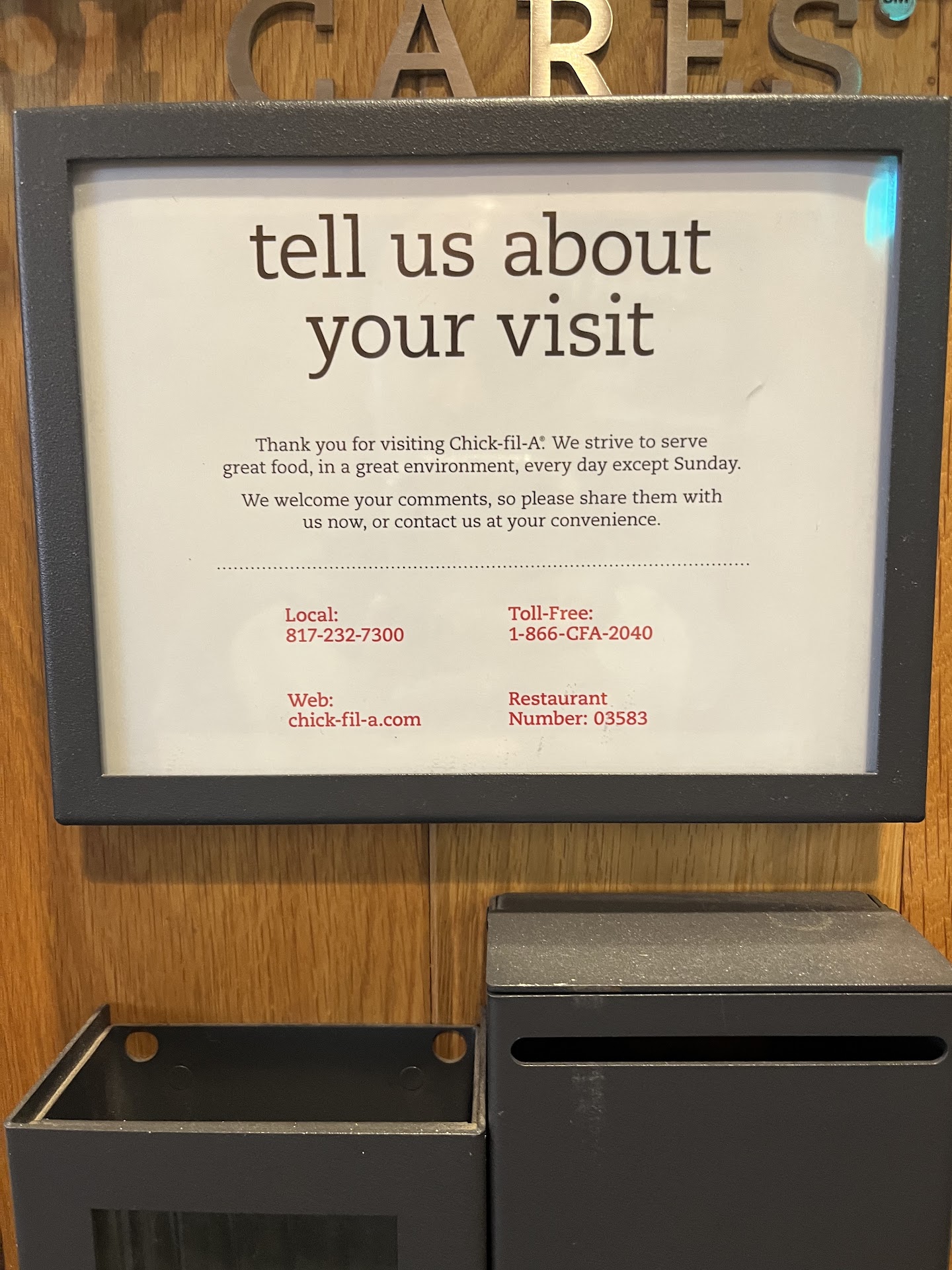 Once she did acknowledge us, the guy mopping behind us started talking over us to get in on the conversation with the two behind the counter and they were all having a grand time while completely ignoring every customer. He should have been paying attention to his cleaning duties as this was also the first time I've seen a CFA where the floor was filthy. That said, the dirty floor wasn't a huge concern relative to the customer service.