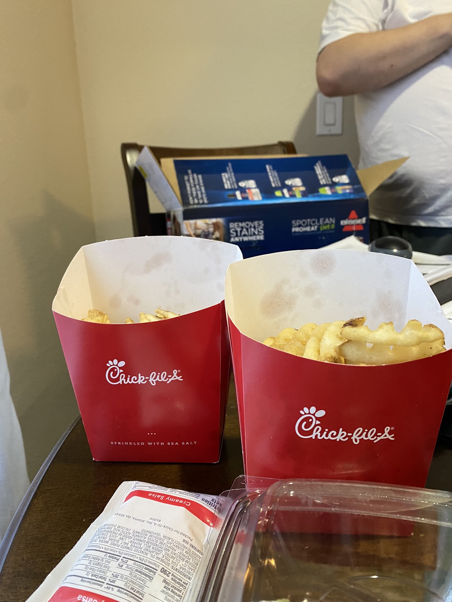 After chalking it up to a misunderstanding then turning to thank the gentlemen for reminding me im not crazy, I waited patiently as the young lady took my old fries back to a group of CFA staff to explain the issue. I noticed she was speaking to a girl in a different colored shirt so I assumed it was a manager and I overheard her say, "OK, well ring him up."