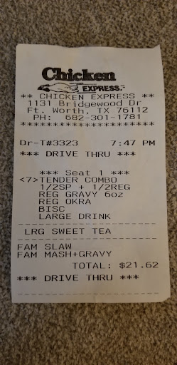Read moreHorrible experience! As a Favor Runner I’ve been to many different Chicken Express drive through. I called ahead because it was somewhat of a big order. When I arrived at the drive through they said they were still working on my order and reminded me that I was early for the time they told me over the phone (2 minutes early!). I said no problem. Got to the window, they took my card and used it for the order that was behind me... No biggie, we got it fixed. Pulled up to wait for the food without blocking anyone. 11 minutes later the worker at the window went running after a truck that pulled out with what turned out to be my order. - as she was coming back I said, was that my order? “No, I have yours inside.” She replied. 4 minutes later her manager came out to apologize for the delay, the mix up with the charge and giving my order to someone else. 🙈 They gave me a gallon of sweet tea. And added a little extra food to the order I was delivering. To be honest, there was nothing they could have given to make it right. I was working towards a bonus delivering Favors and because of the time this order took I wasn’t able to...