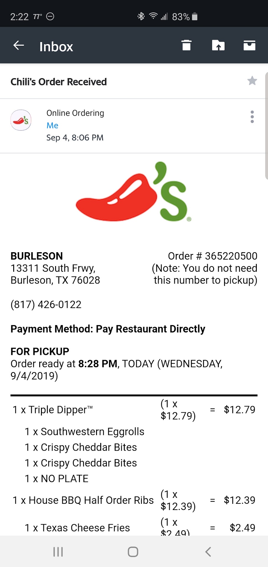 Read more3/14/18 --- Our server, Jess, was absolutely amazing. None of what we were upset about had anything to do with her and her control of the situation. We were there for my aunt's 50th birthday and had a party of 19. We have been going to Chilis Burleson since we moved here 5 years ago, and we have always had good experiences. However, we have never had to wait 2 whole hours to be sat. It was ridiculous. We had a baby and a few elderly people with us, as well. We were told that a reservation of 20 people had been canceled and that we were next to sit down. All the while, 4 of our party left and the couple with the baby had to sit down in the cocktail area so that they could feed their special-needs baby after an hour of waiting. After 2 hours, the host (who I felt very sorry for), was able to arrange an area for 12 of us to be seated, NOT our entire party - or what was left of it. While we began to take our seats, the Front of House manager on duty was putting together tables for another party of 20 that called in for an 8:45 reservation, a reservation that was called in WHILE we were ALREADY WAITING. She NEVER came and spoke with us the entire time we waited. It was only until right before we sat that she actually addressed my cousin. How is it acceptable for this to happen? If I had made a reservation on my OpenTable App or called in while we were already waiting, would that have helped us to be seated more promptly? Possibly ahead of the NEW 20 person party that was sat and didnt have to wait 2 hours? This was terrible service. I don't know what the manager was attempting to do, but you could tell that her lack of experience and customer etiquette created the worst Chilis experience that we've ever had. If it weren't for fear of ruining my aunt's birthday, I would have walked out and taken my family elsewhere. I won't be wasting my money on sub-par food and service at this...
