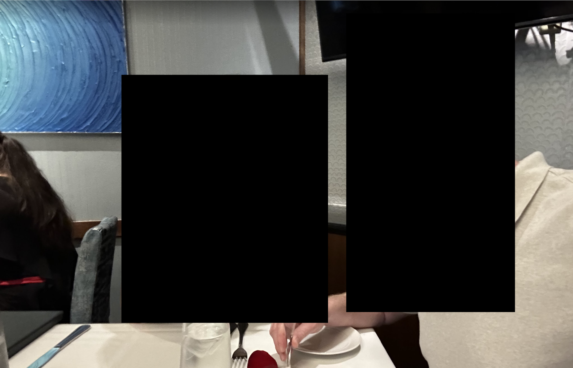 When we were shown to our table I thought perhaps I had blacked out and woke up inside a La Quinta Inn's continental breakfast room. It was a small back room that had those granite countertops with cabinets underneath on two sides of the room, a giant TV right above my wife's head with exposed wires, and hideous light fixtures and wall art. The waitstaff occasionally stacked plates and silverware on the countertops, not 2 feet away. The piped in elevator music was also terrible, especially after thinking we would get to hear a live jazz band. I cannot stress enough how much it looked like we were dining in a cheap hotel. A couple that was sat a while after us asked to move, and we later learned they waited about an hour to get a seat in the "main" dining room. The group that sat after them were also making jokes about how bad the room looked. Go ahead, look at the selfie we took. If you saw that photo with no context, how much would you think the meal cost? Three hundred plus dollars, or self serve waffle machine and box of Froot Loops?