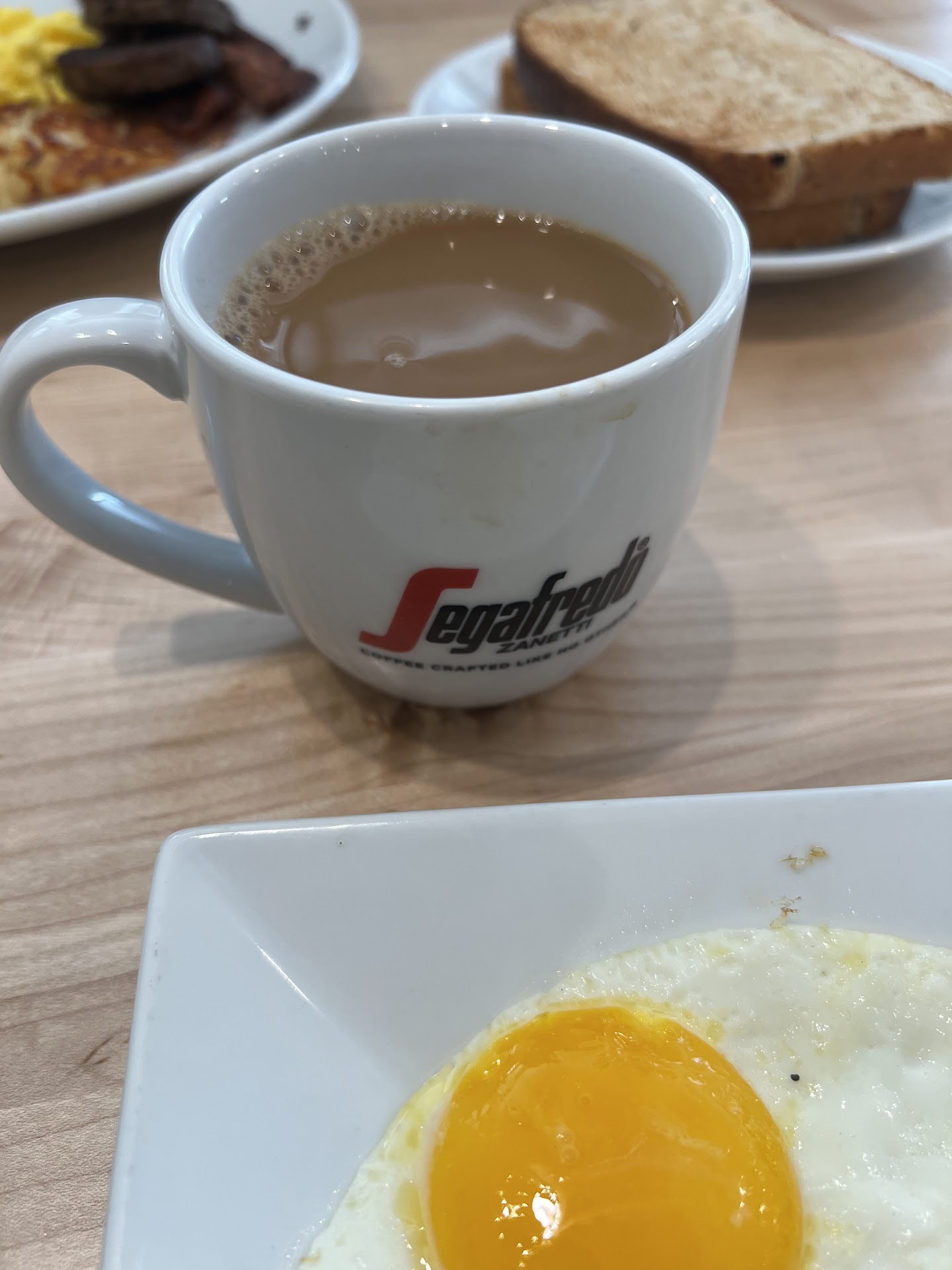The coffee was very good. To eat we had the Crab Cakes Benedict, southern breakfast combo and the avocado toast. Crab cakes were slightly under seasoned. But the poached eggs were cooked perfectly and the hollandaise was very flavorful.