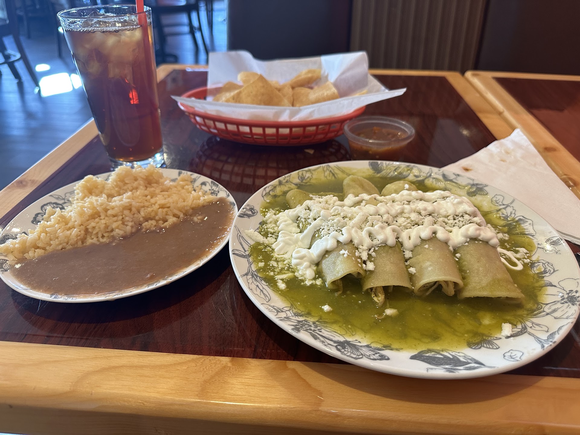 Read moreWe were there in mid afternoon. One other table in use. The booth seats were a bit too soft, but manageable. The service was great. Water is bottled so you pay for it. Chips were nothing special, but OK. Looked like the ones in the big box from Costco. Salsa was moderate heat, good, but a little thin for my taste. I like a little more body. My wife ordered the Salada con Pollo. It came with the items separated, just the way she likes it, rather than all mixed together. Ranch dressing on the menu, didn't ask if there were other options. She liked it but would have preferred mixed greens rather than just lettuce. I ordered the Pollo Enchiladas Verde - four standard size flour tortillas filled with chicken. No complaints on serving size. The verde sauce was very tasty. It was moderately spicy, just about right for me. I'll be back to check out some...