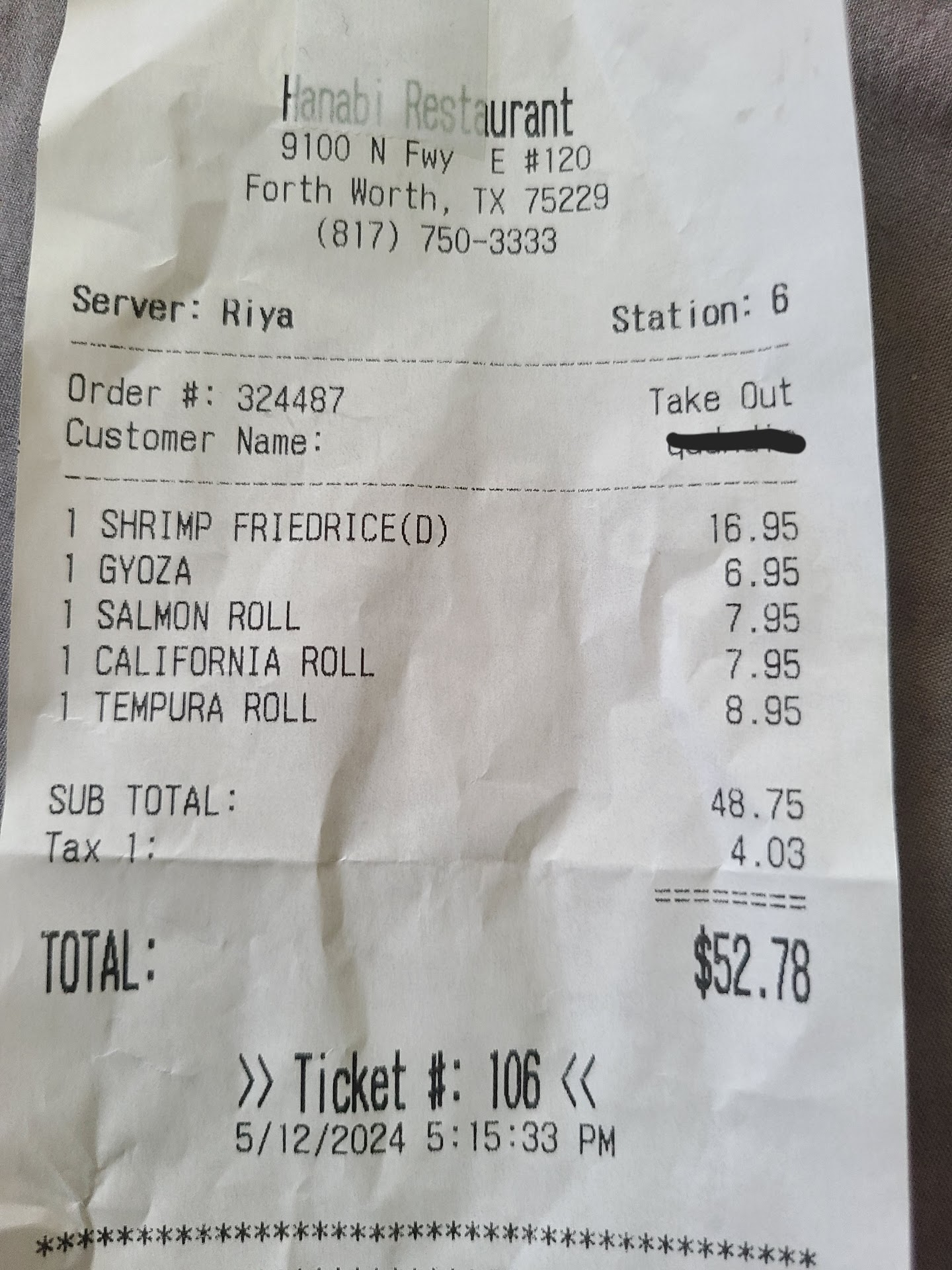 Read moreI've been to Hanabi several times, and always had a great experience. Tonight however it was really subpar. I ordered the NY Strip, which was misheard as being shrimp. When the chef came out and read back everyone's order, he said mine as shrimp, and immediately moved on to the next person. I could hardly hear him over the sounds of the other tables and vents, plus shrimp and strip can sound similar. When he asked the other group how they wanted their steaks cooked, he looked at me and said "ah chicken medium yes?' I looked confused and said I had the strip and I wanted it rare. He looked at the order form and nodded and began cooking. After he passed out the other steaks, I mentioned to our server that I should also have steak but there was none left. She asked him about it and he told me "I asked if you had shrimp and you said yes!" Again, it was hard to hear, and he moved so fast I didnt even have a chance to respond. My steak was brought out and cooked. The shrimp he had been cooking for me was scraped off the grill and thrown away. He also got rid of some of the shrimp appetizer, meaning that I and somebody from the other party didn't get any shrimp at all. Besides this, he put on zero performance- basically going through the motions, and not even well. The onion volcano was sad and not stacked properly, so it was just sliding as it flamed. That was the most show we got. Besides that, I was the only one at the table who got regular rice instead of fried. Usually this is one of the first items out, but I didnt get my rice until after the meat started being served- well after everyone who had fried rice got theirs. The waitress was nice enough, and very apologetic over the protein mix up. But overall we were left very disappointed. The food was great but the whole draw of hibachi is the show- that we didn't get. I am willing to go back to Hanabi, as past experiences have been much better, but if the service doesnt improve it will be...