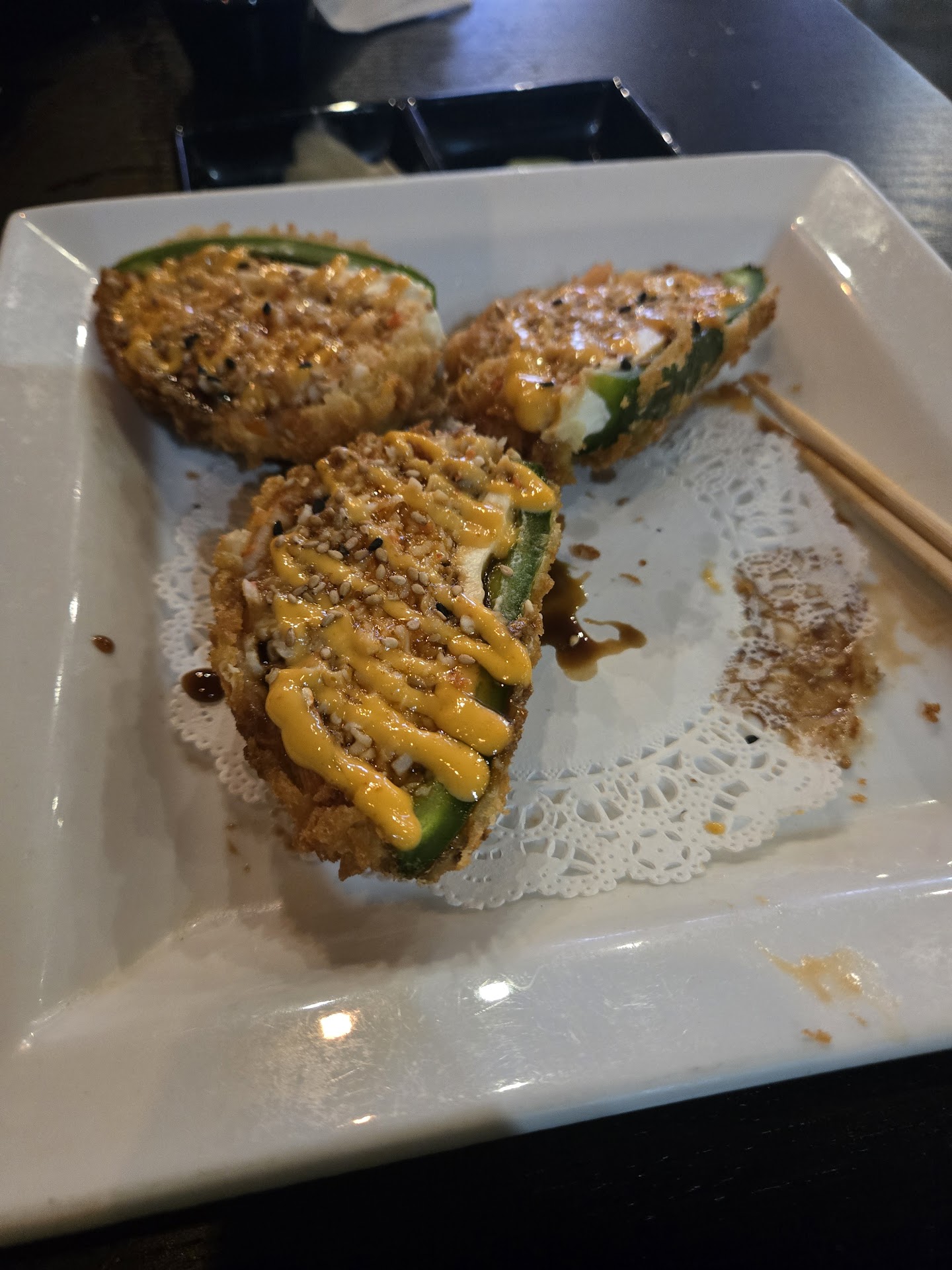 First, the 'Snowball' roll. It had cream cheese, Jalapeños, and fish (of course) but I can't remember and it was deep fried to perfection.