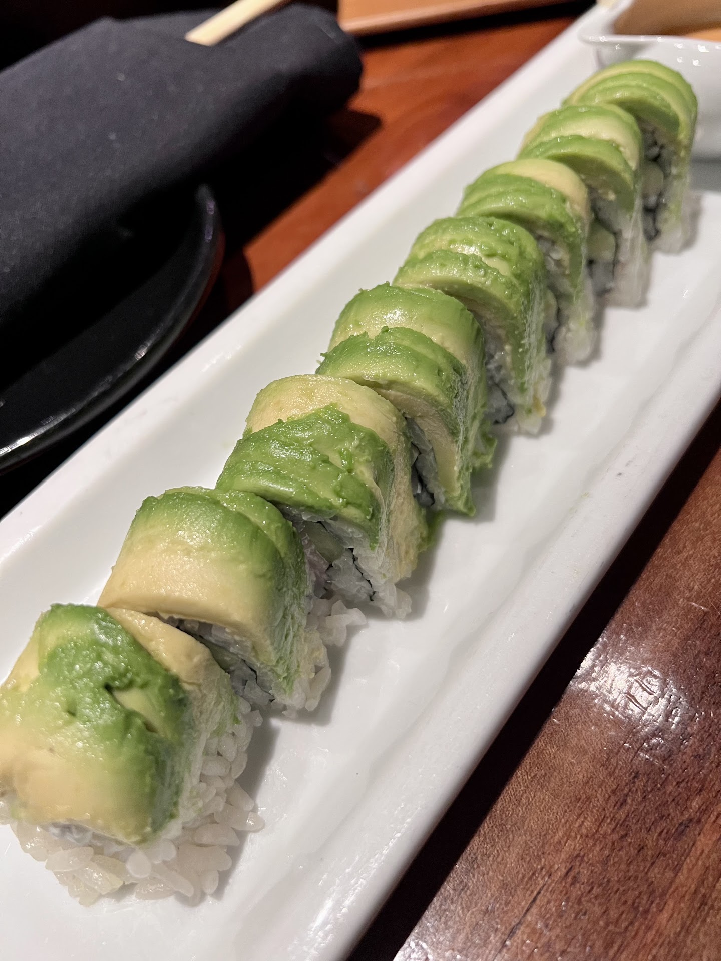 This roll has no rice, it's wrapped in cucumber and filled with avocado, salmon, and tuna topped with ponzu sauce which I think they forgot.