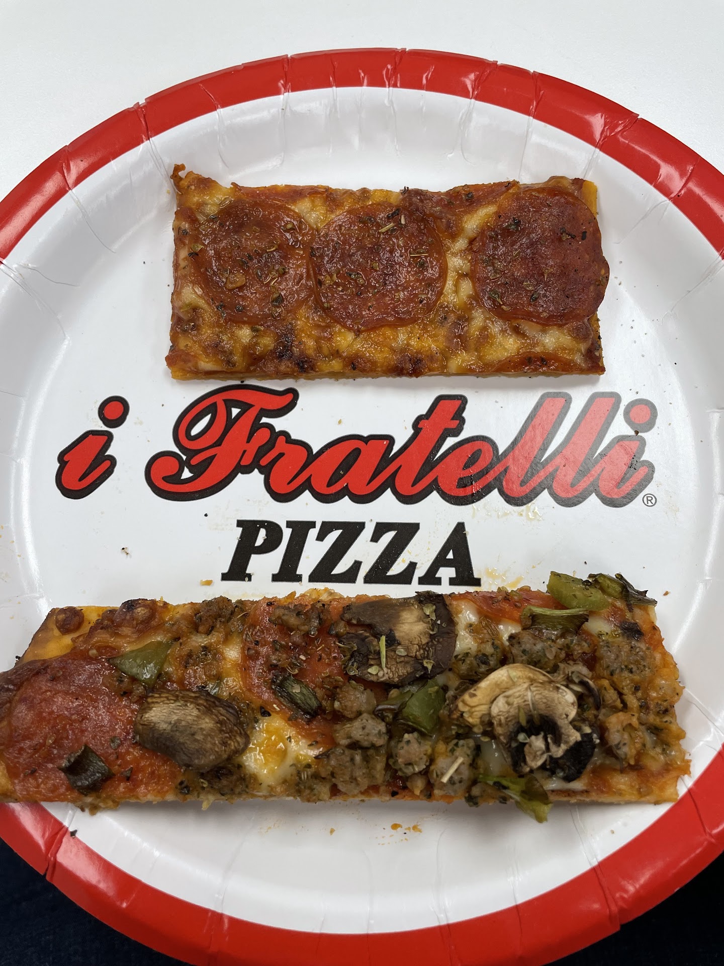 Absolutely love the way they cut the pizza into strips instead of triangles. I'm a giant fan of crumbled sausage and there's literally not a square centimeter that isn't covered with a topping. Big containers of fresh ranch for only $0.50. and cool little cutouts on the top of the box for containers of Parmesan cheese. Not some teeny tiny paper packet. An actual serving.
