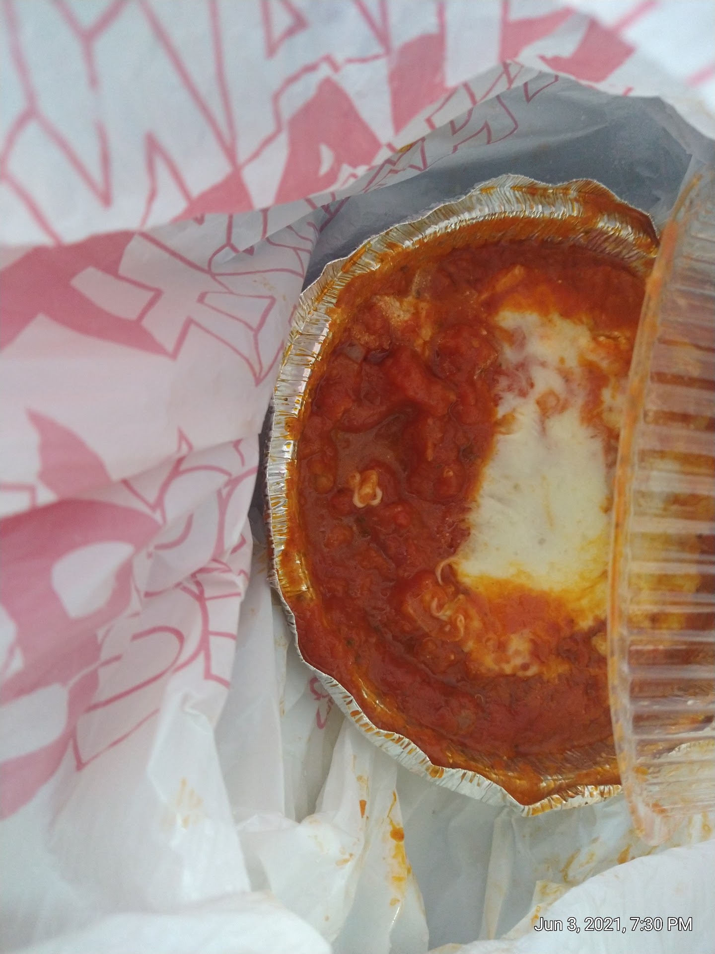 But then... today we returned and everything was off. We were placed in a small booth with no waiter assigned. The owner got our waters and took our order. I ordered the spaghetti with meatballs and my co-worker ordered eggplant Parmesan with spaghetti this time. The salad, the bread and the food came in quick succession. They didn't time it right and it was suspicious how quickly the food came, like it had been sitting there. There was a new cheesy topping on the bread that I didn't like. The cheese tasted weird and the bread was less flavorful. It was also barely warm unlike last time. The spaghetti was a joke. It did not have enough sauce by anyone's standard and it came with one meatball! The menu said spaghetti and meatballs not meatball. The whole dish was flavorless and watery. A freezer spaghetti was tastier. No one came to ask us how the food was or fill up our waters. The hostess was kind enough to clean out some dirty plates from our small table. We started to wonder if we had to get our own check. Finally, we asked a busboy for the check.