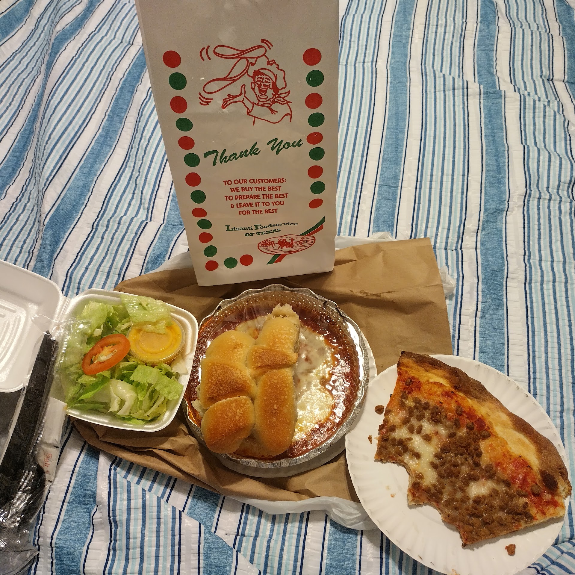 Read morePizza is a hit and miss. Sometimes it's great, other times it's just OK. I haven't eaten inside yet, so I am not sure if it's due to different people making the pizzas. The marinara sauce has a hint of cinnamon in it, which I loved, but if you have food allergies be aware. Since I always order pickup, they keep forgetting my salad. Pasta dinners according to their menu comes with bread and salad. I would strongly advise that you check your order before leaving. Stromboli was tasty and cheesy, but didn't have enough meat for me, but again lots of cheese! Spaghetti with mushrooms was disappointing. I was expecting chunks or slices of mushrooms. Instead they were finely diced and mixed in with the meat sauce so I couldn't see the quantity of mushrooms that was included. Meatball and Philly subs were tasty, but not enough filling. Too much bread to filling ratio. I was still hungry after eating the Philly sub. My meatball sub didn't have any cheese. I was expecting a layer of melted cheese on top of my sub so it was disappointing. I ordered a couple of family meals. Spaghetti with meatballs and lasagna. The food was great. Quantity actually fed 10 people as advertised. Again, they forgot the family sized salads. The lasagna is made to order so you don't get a slice of layered lasagna. It's different so you may prefer their method but I prefer the old fashioned layered lasagna. Overall, the food is delicious. But I probably won't be back for awhile due to forgotten items and the cost...