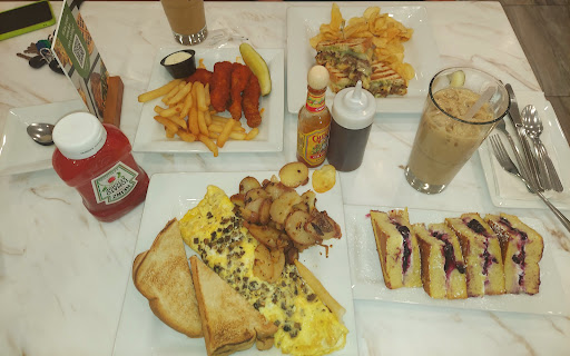 Me and my hubby were driving around trying to find a new spot to enjoy brunch/lunch, and stumbled across this place. We were very pleased to walk into a quiet, cozy, and clean atmosphere. The gentleman that seated us was very courteous, and our waiter James M. was very tentative and made sure we had everything we needed. The food surprisingly surpassed my expectations! We will definitely be returning again. We ate until we were full and still had plenty more to take home. I stuck around to ask our waiter if I could keep the branded pen my hubby used to sign the receipt, and he said yes? They have plenty and I could have just taken it. I said thank you but I just wanted to ask first. I'm a very sentimental person and me and the hubby have not gone out alone on a lunch date without our 1yr old twins since before they were born. So I wanted the pen to commemorate our time out. 10/10, highly recommend!! Our twins ate off of our takehome and enjoyed it as well! I got a cheese omelet with mushrooms and blueberry stuffed French toast. My hubby ordered the cheese steak panini with kettle chips and buffalo temders with fries. Drinks were iced coffee. We tasted everything. Love love love...