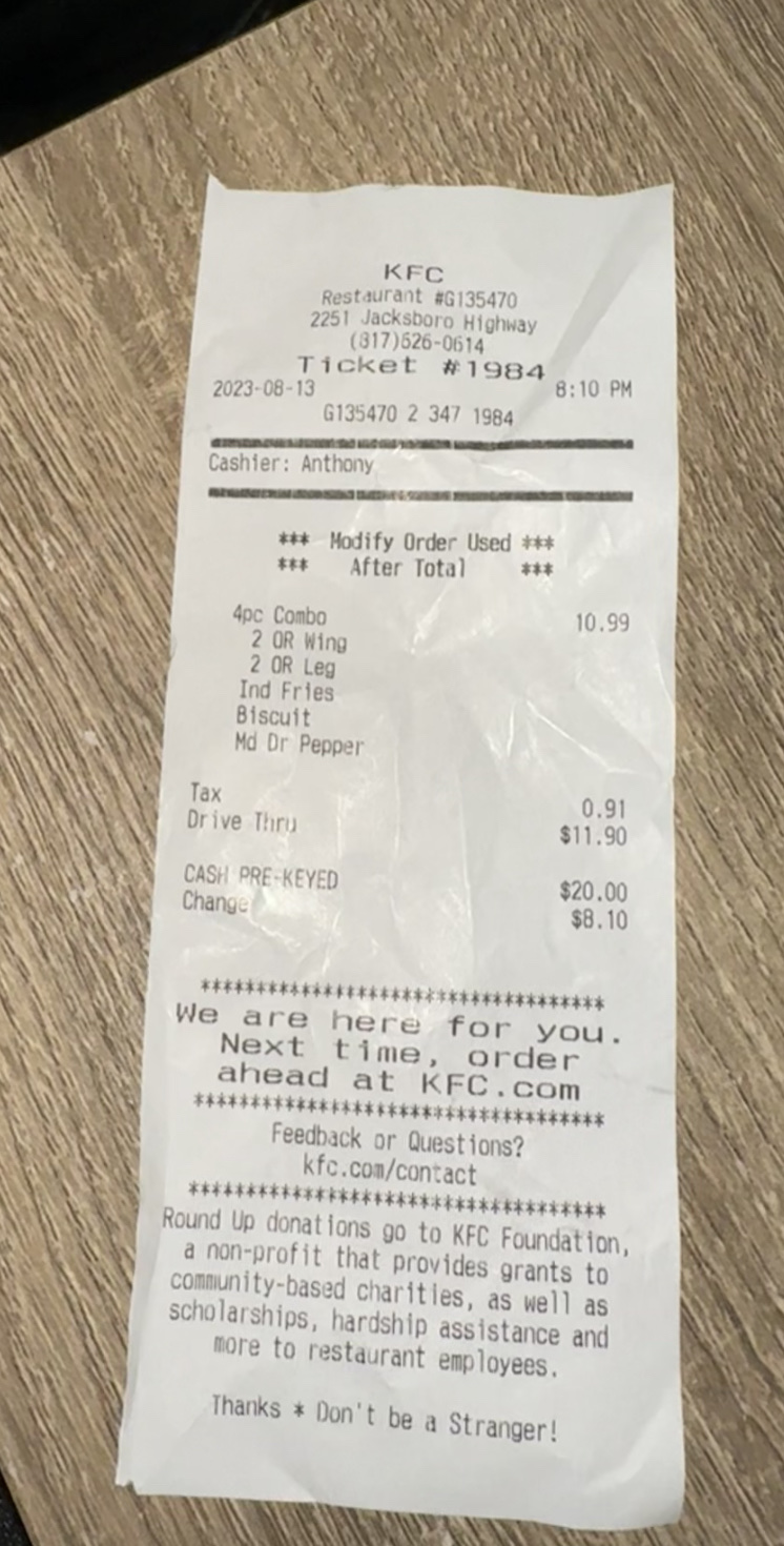 Read moreEvery single time I have gone to this location there is ALWAYS ALWAYS ALWAYS an issue and I’m the type of person that doesn’t participate in surveys most times previously I have gotten wrong ordered never offered condiments unfriendliness. And today the girl was nice I made sure to ask for condiments and check for them. But I ordered fries instead of mashed potatoes and I get home only to see that my receipt says substitute fries and I didn’t get them. On top of that I have called the restaurant 3times and no one answered the 4th time someone picked up the phone and and quickly hung it back up! This is the worst fast food service I have ever had every single time I have gone there! It is so unprofessional not to mention beyond aggravating for one place to mess up every single time!! I will be posting my unsatisfaction on social media as well as yelp. And hopefully the next person that goes to your restaurant will not have to deal with all that I have dealt with at ur place...