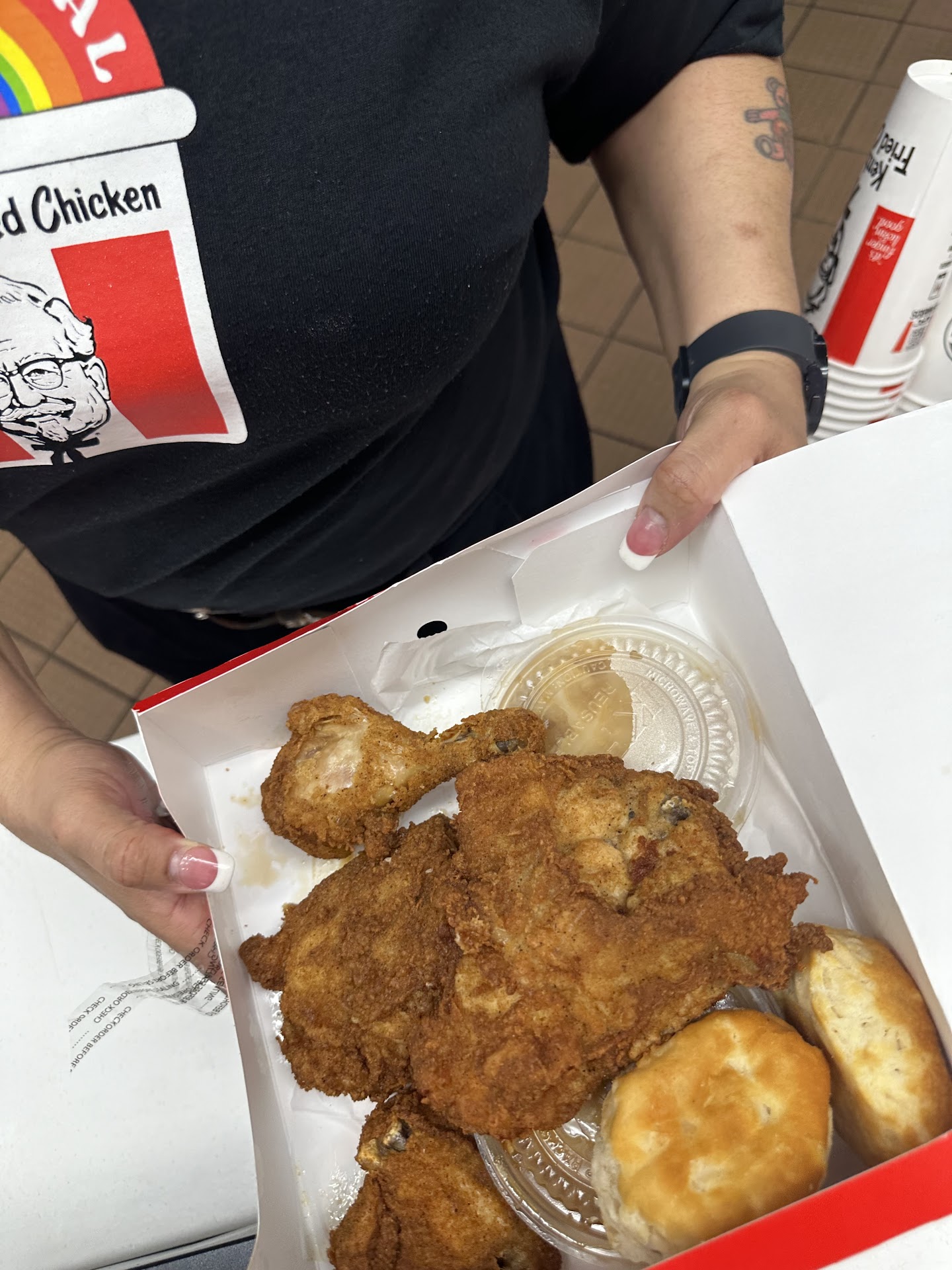 Read moreMy daughter and i had gone in to eat 9/21/2024 for diner around 5:30 -6 pm there was a young black woman working registered she had just taken a black woman but when it came our turn to order she said we have to use the kiosk claimed they were under staffed but anyone could see they had plenty of staff back there there were so many they were getting in each other's way. We used the kiosk even though we do not work there it's not our job to use the kiosk it's there job to stand there and take my order after all she was already standing there. Well like I said we were hungery so we used it we ordered drinks with the meal we turned around and waited for her to return after a few minutes of being ignored at the counter waiting for our drink cups my daughter reached over and took two small drink cups she yelled back just getting our cups since it's self service we'll when we recieved the food 15 minutes later it was old and dried up about the time I dropped my chicken back in the Box the same young lady came out accusing us of stealing drinks when my daughter started to show her the reciept she didn't want to hear anything she said and stated next time I'm calling the police for what? She was rude treated not only us rudely but several other people the same way abd while we sat there that 15 minutes 4 people came in to pick up their online orders just to find that the manager of the KFC had canceled the orders this place needs to be shut down till they can find a better management and staff I've never been treated so poorly as I was...