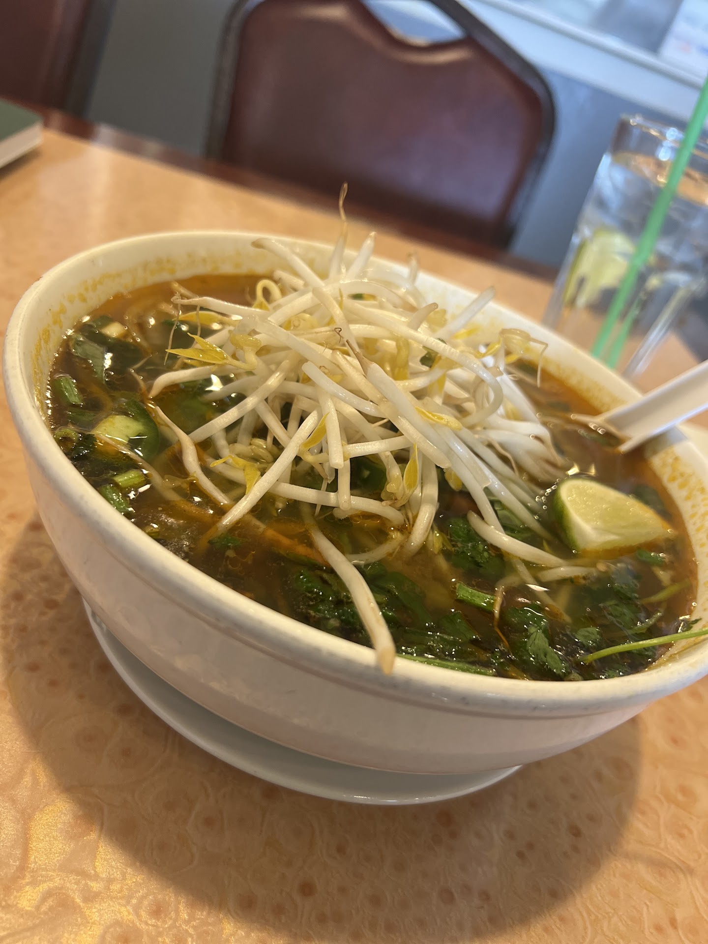 Kid working counter asked that I sit anywhere I like, I approached the register anyway to make a to-go order. He looked a bit surprised. I don’t think this place typically does to go orders... I ordered pho tai chin and a honeydew boba tea. $22 before tax and tip. Boba tea was really good. Surprisingly good. Pho was ok but broth was bland and not hot, not lukewarm, but cold after a 12-minute drive. This is my favorite type of food so I was excited to try it given all the good reviews. Maybe I just ordered the wrong thing or should have never ordered take-out in the first place. They added all the sauces to the bag and chop sticks, but there was no bowl or spoon. Just a tub of broth and a styrofoam box with all the noodles, meat, and veggies.