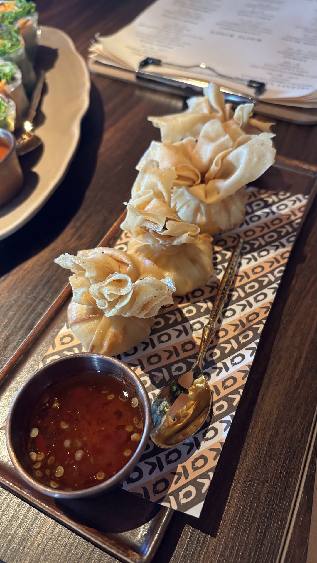 Cream Cheese – Beautifully presented like little golden purses, perfectly crisp and paired with a sweet chili dipping sauce.