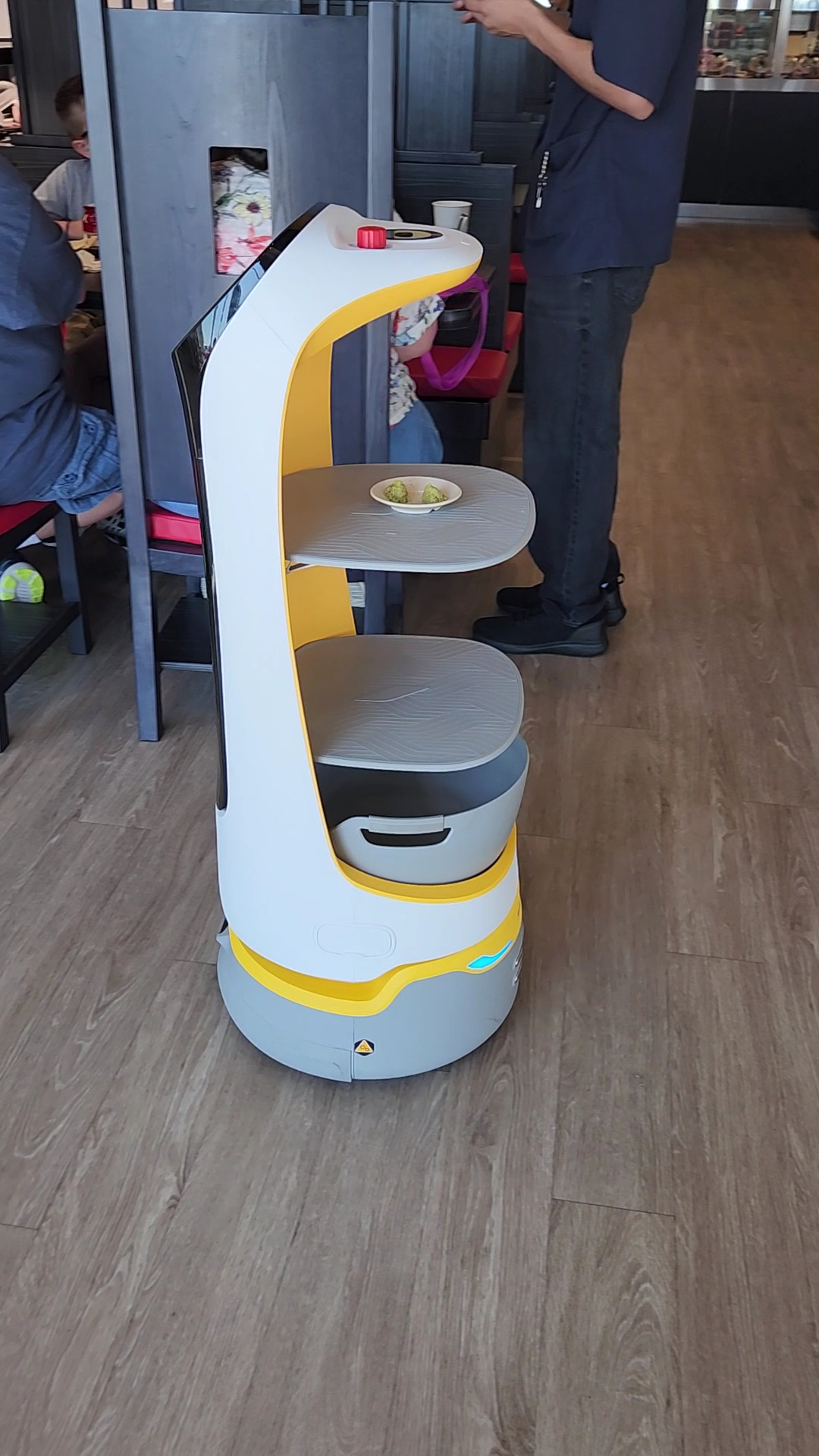To start, you are greeted by a host and seated, but after that it’s completely self-driven. The menu and ordering system is on a tablet placed awkwardly high and difficult to reach. We ordered two waters and a little robot playing music showed up and delivered them along with chopsticks and wasabi. The revolving dishes do pass directly by you and you can just open the little domed container and grab the plate. Most dishes are available there but you can order anything on the menu and it shoots down a long, straight conveyer right to the table. The speed of service was quite impressive: a matter minutes to seconds.