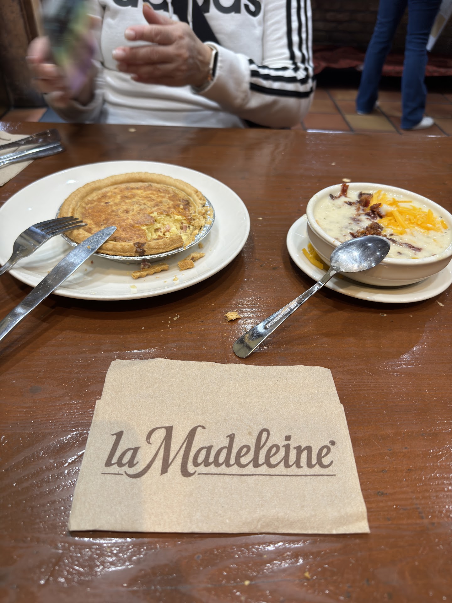 Read moreFrom out of town and was looking for a different food choice then the normal. Found La Madeline about a 5 min drive from our Hotel. We visited this restaurant 2 days in a row, did breakfast and dinner the first time then just breakfast and a to go the second day. Day one when we first walked in bright and smells clean. Didn't get a welcome but the cashier was helping someone so that is no a problem. The cashier was pleasant to spoke with and helpful with my questions. We asked for recommendations when we could not decide between 2 items. That didn't disappoint. Got fruit tarts, a chocolate tart with our breakfast of blueberry cheesecake French toast so good, then I got the waffle with a benedict egg on top with a side of harsh brown did not need any salt or pepper great the way it was. Dinner we got pesto pasta with a bread side so good, and the La Madeline chicken and rice dish it was plain nothing special. Ordered a chocolate croissant should have asked to have it warmed up would have been even better and a creme brulee it was so good. We did meet with a man possibly one of the chiefs that night he was sweet and helped with the welcoming feeling. The waitres was nice also but didn't get any names the whole time but that didn't bother us. Sunday day 2 for breakfast we got the blueberry cheesecake waffles definitely more sweet then the fresh toast option but still good, also got the La Madeline crepe and the flavor was much better and worth getting. Got several items to take back home with us for our family and will be coming to visit when we come...