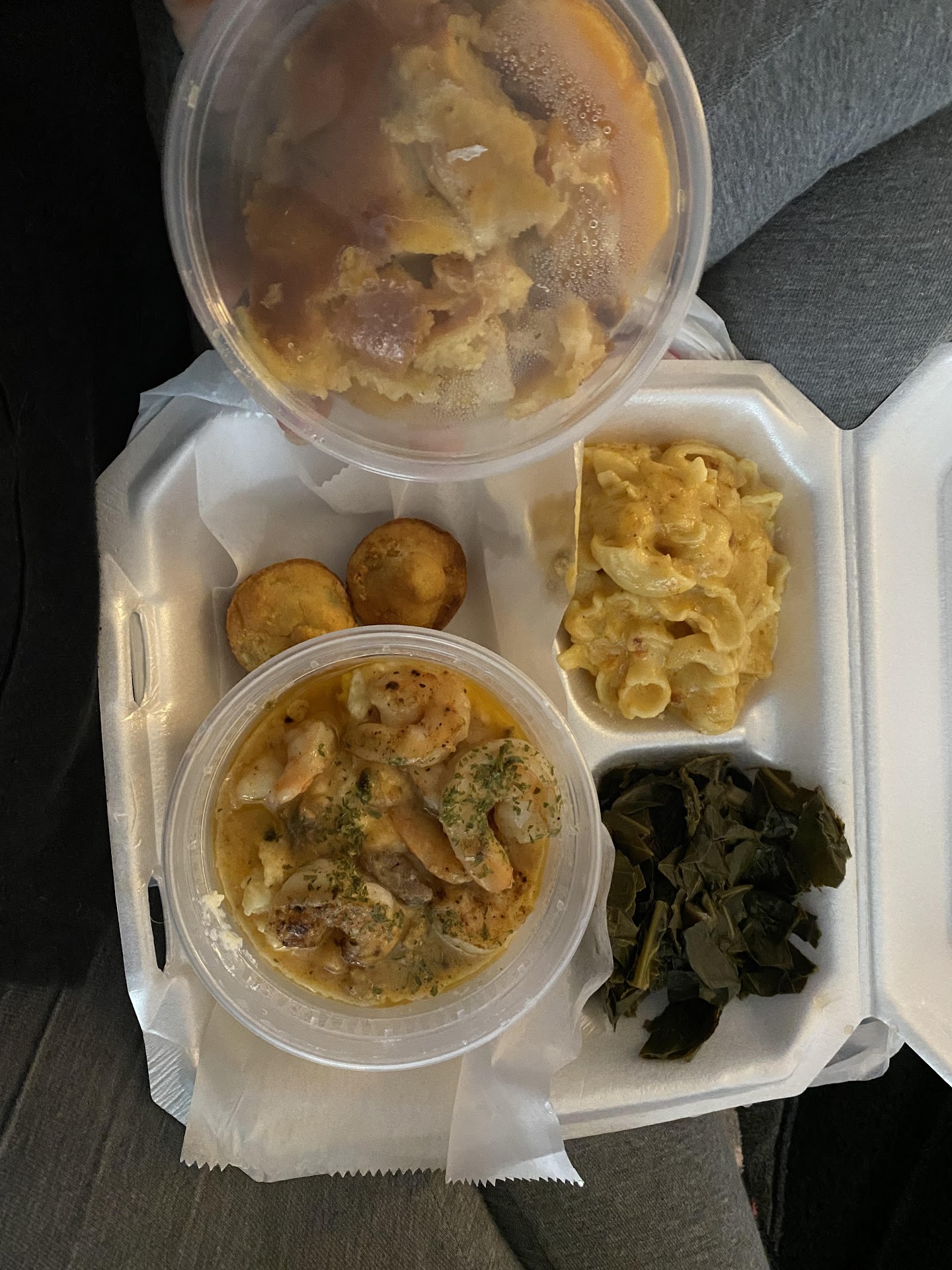 Read moreI got take-out for lunch with my neighbor today. She picked it up and I didn't go inside but she said it was cute and clean inside with a couple tables that looked like people could dine-in. The gentleman that took the call when I ordered was so professional and helpful and everything was accurate. I tried everything pictured and you can tell the chef is passionate about what she does because the quality and taste was top notch! The mac and cheese was BOMB! Not overcooked and so flavorful. The little jalapeno cornbread bites were good and left me wanting more. The greens and cabbage were flavored and cooked to perfection, in my opinion. None of the food, including those were overly greasy/oily which I really appreciated. The smothered ranch chicken was tasty and tender. The shrimp and grits (which is one of my favorite things to order on any menu) was very impressive. Tails off and CLEAN shrimp all the praise hands!!! and cooked perfectly, not overcooked. The grits were fluffy and creamy! Add some hot sauce and wowza! Everything was packaged nicely and included all I needed to eat wherever without making a mess.