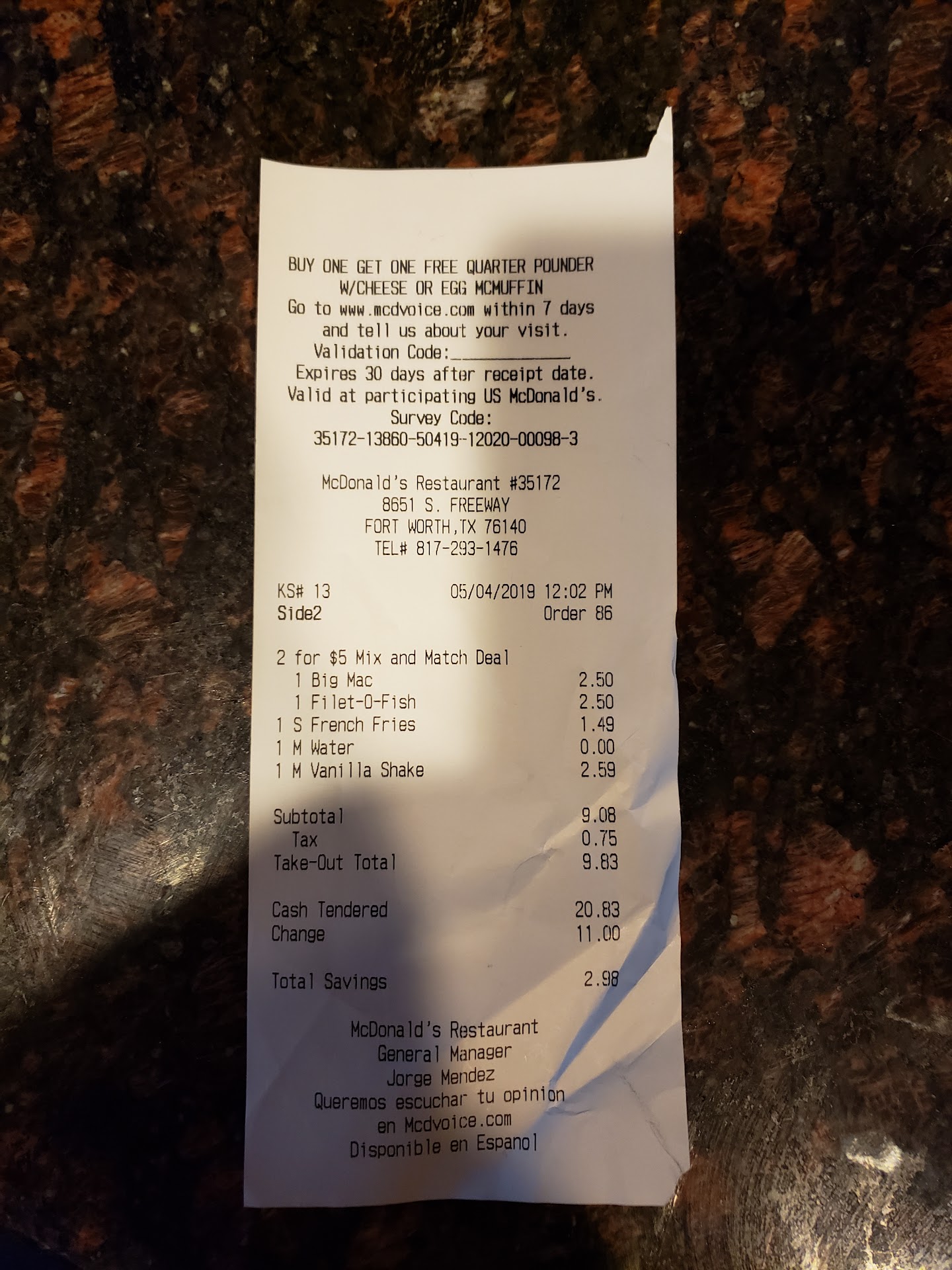 On Saturday May 4th at 12:02 PM (three days ago) I ordered the food on the reciept in picture.