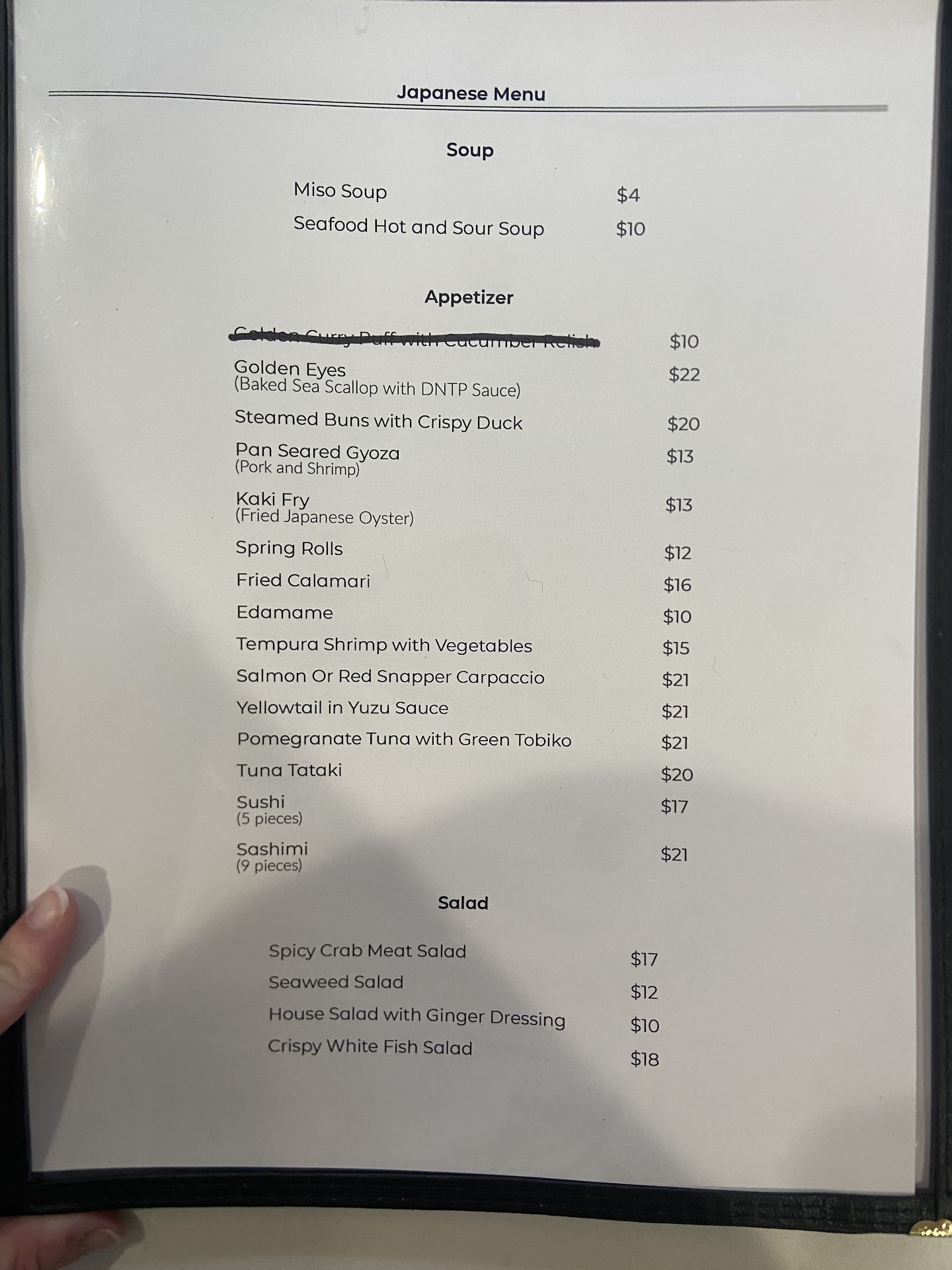 The concept is interesting: Japanese AND French INDEPENDENTLY (NOT FUSION). I’m all for interesting concepts but the execution here is not good. You’re given 2 VERY FULL menu books of both Japanese and French. In the same restaurant with just a couple tables seated you can order sashimi, sushi boats (tactlessly named aircraft carriers ?wut?), omakase, ramen, Japanese curries, udon, tempura, dumplings, french entrees (steak au poivre, duck, lamb), french onion soup, salads, an 8 course tasting menu, desserts, etc…