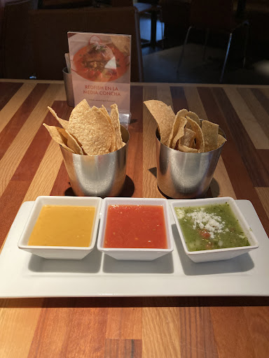 As soon as we sat down, a trio of salsas and chips were delivered to our table. My favorite is the orange salsa. I have no idea what's in it, but it is the tastiest of the bunch. The green salsa is my second choice, and I didn't care for the red salsa. It tasted just like a pureed tomato with no seasoning or heat. We ate through these pretty quickly, and a staff member noticed and refilled our chips and favorite salsas without us saying anything! Very attentive service.