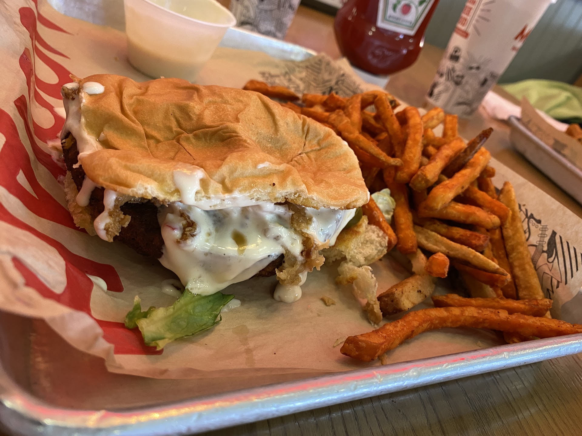 When we got our food, my burger and my partnerâs burgers were mixed up, being on different platters from our correct fries (they got regular fries). Getting that sorted was simple enough, but it was another quirk in the experience.