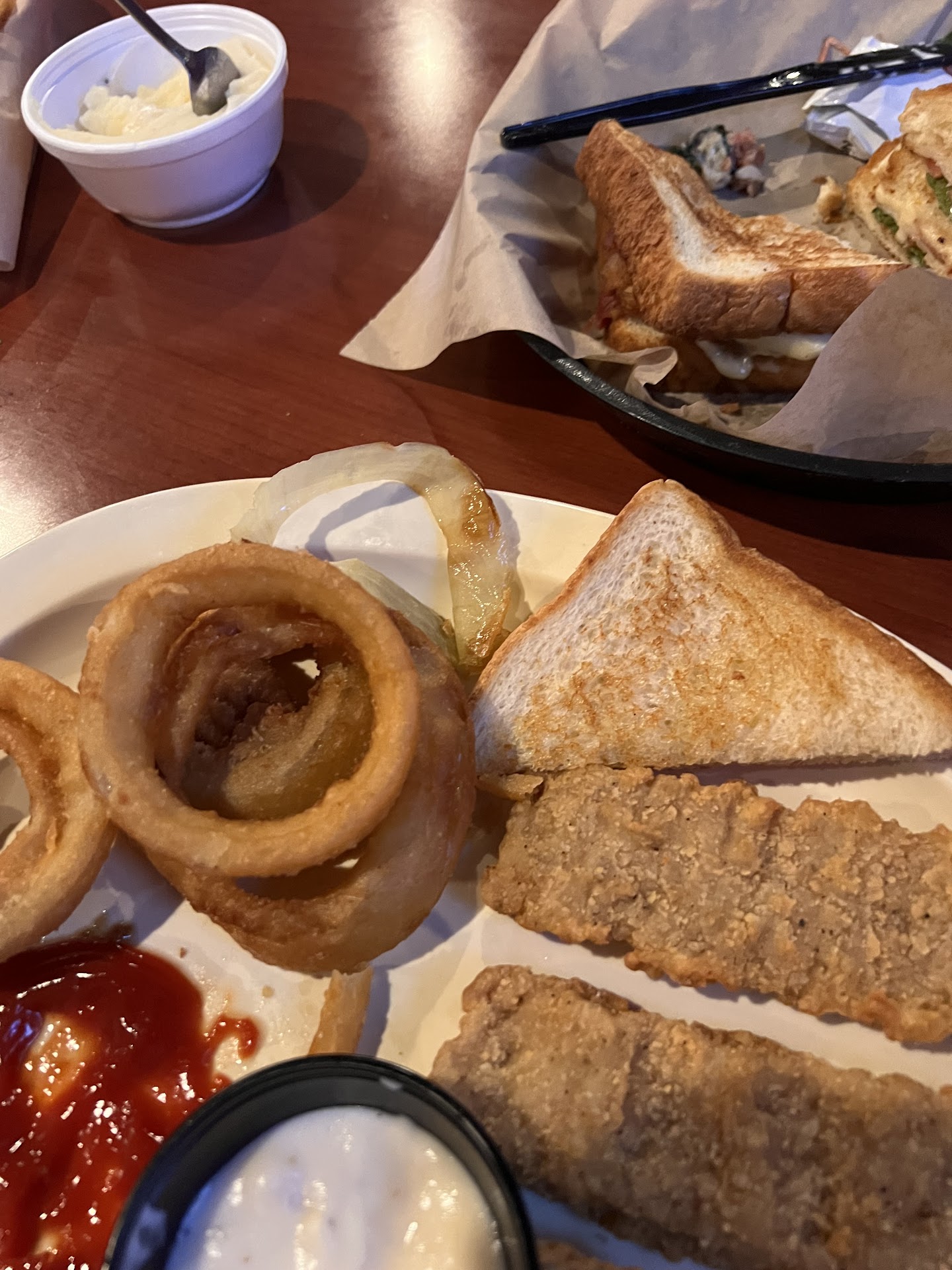 Read moreWe have been told about how good this place is so my husband and I had to come try it. Iâm not sure what all the fuss is about. We wonât be back. First the coke was absolutely horrible tasted all syrup. That should have been all I needed to know. So I asked our waitress was the chicken fried steak real and she says yes. So thinking since thatâs real then the steak fingers would be also but no they came out just like DQ pre frozen. A good waitress would inform you of them being fake seeing you asked about the steak being real. The onion ring on the plate were so filled full of grease itâs unreal. My husband asked for a club and was told all vegetables would be on the side which were not. A club sandwich that had the turkey cooked on it which Iâve never seen. The bacon was flimsy and horrible. He took maybe two bites and weâre done. We had to ask for his fryâs that he had ordered and they came out like they had been sitting there and all they did was buy them back in the grease. Extremely greasy and very hard. He did how ever eat his side salad but again the waitress assured him there were no carrots in it and there was. Iâm not sure she knows all the food. She was aware we didnât like the food at all and brought our ticket them brought a second ticket and told us the manager would only allow her to take one meal. The manager was leaning on a rail most time we were their. You would think he would have came and asked what was wrong with our food. You could clearly tell they are not about the customers or the appearance and taste of the food. Pictures are of the food we left...