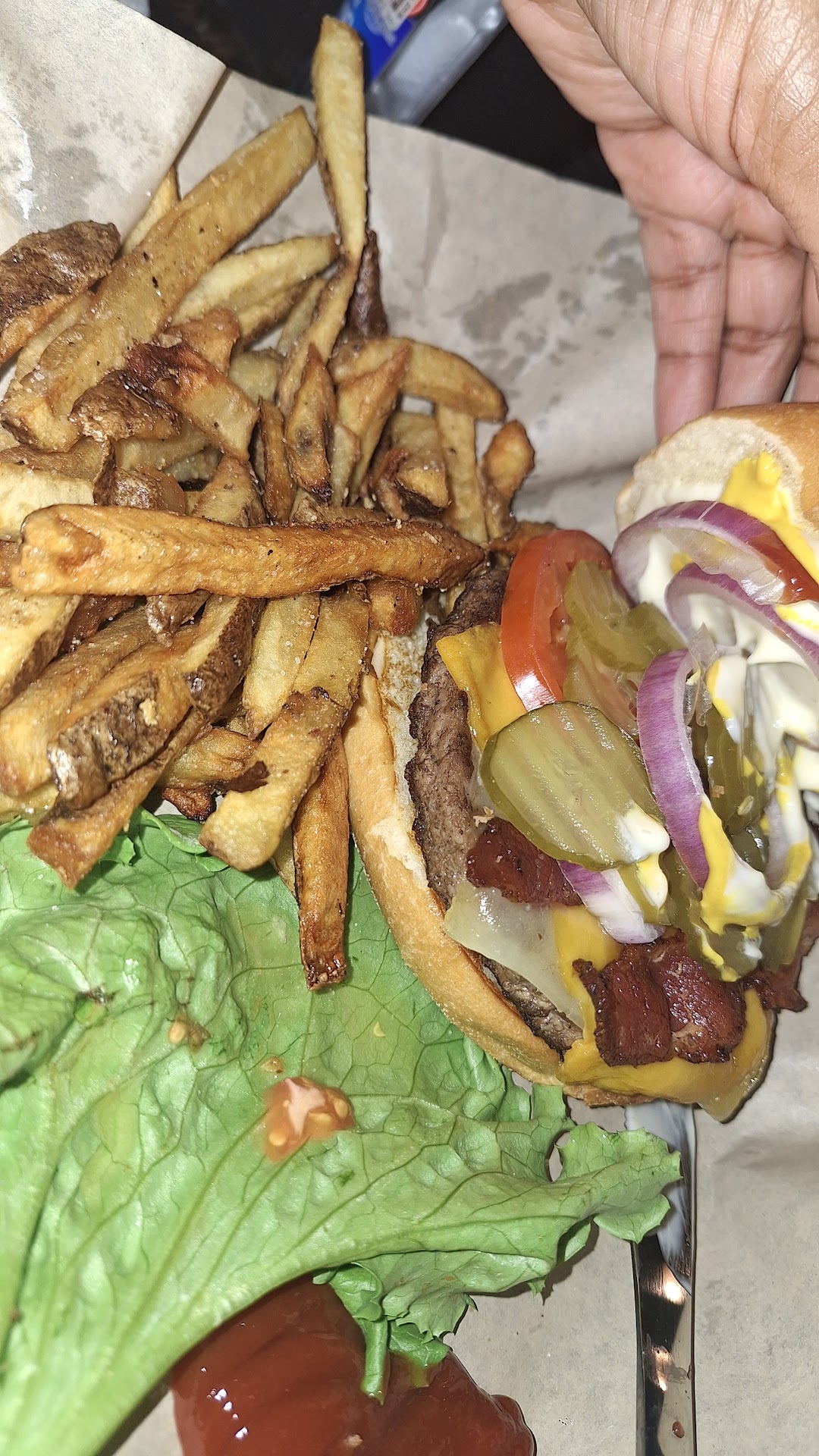 Read moreWent to the nearby movie theatre with the fam many years ago. Aunt was hungry and decided to stop here to sneak food into the theatre. She got the Philly cheesesteak. I remember it looking soooo good but she was like it's just ok. Nothing great. Well I frequent this area quite often and have skipped over it until recently because it seems more like a loud sports bar. Not my type of crowd. Well I was recently invited to come watch a game and agreed to come and decided to finally try some of the food myself. Yea; no never again. Fries and Dr pepper great but that's where it stopped. The bacon cheeseburger just wasn't flavorful at all. I decided to try a piece of the meat by itself cause I kept thinking wow this seems awfully bland maybe the toppings are just overpowering the meat. I tasted the patty and it's the patty. Quite bland. The burger gives very much frozen filler meat patty. My dinner mate tried it and agreed. For the life of me i can't recall what they ordered aside from the pinto beans. They said their food was just ok too. I also got the funnel cake fries. They were ok. Not bad. I'm not a drinker so I feel like this place is total bar food. Meaning if you're drinking and into the sports on the screens, i don't think you'll clue in on how mediocre the food is cause you're just there for the good time. Our server was great though. Great attitude despite a group of annoying guys she had...