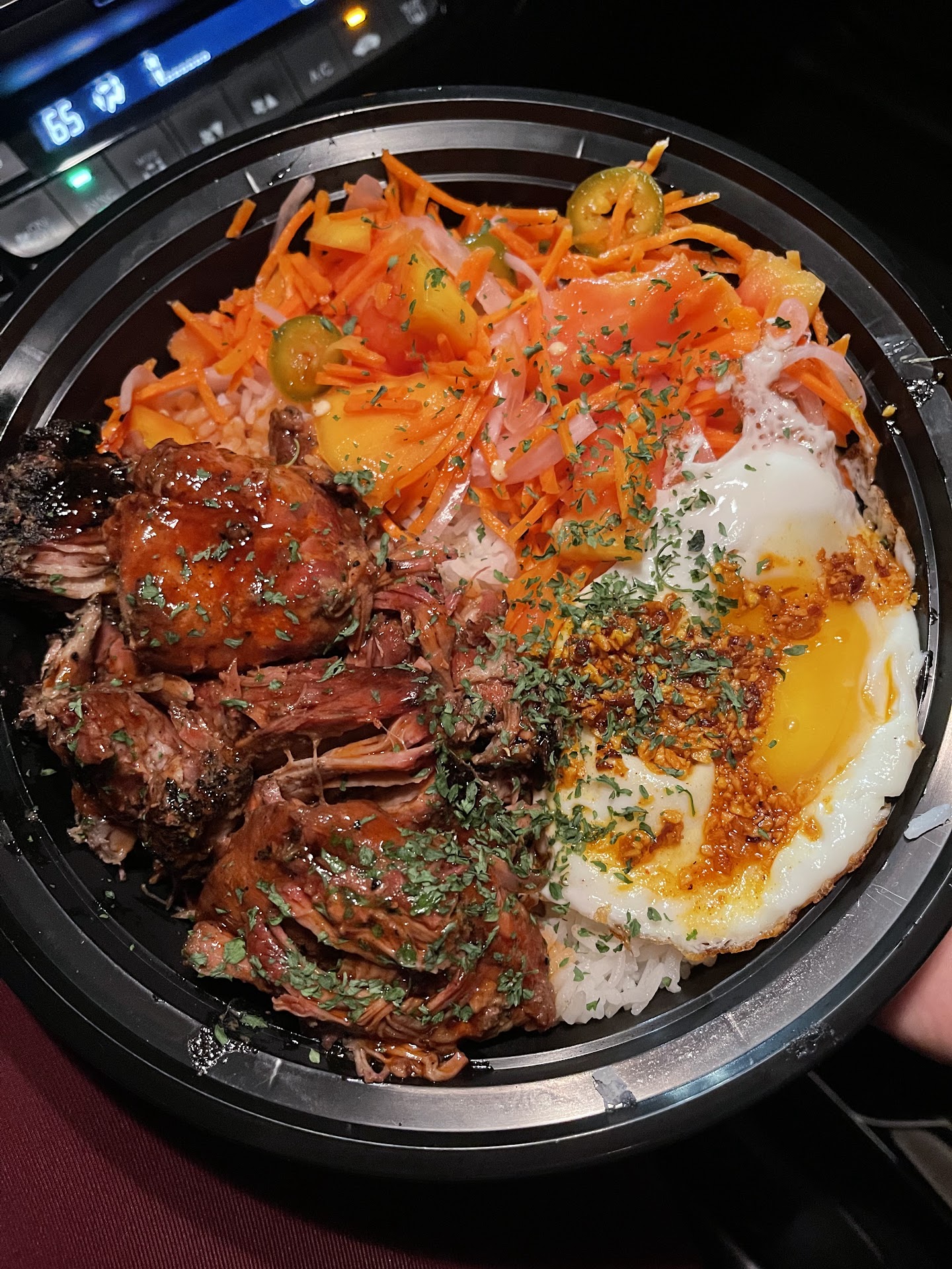 However, I found that the overall flavor profile of the dish was a bit lacking. The sauce that came with the pork didn't have much depth or complexity, and I was hoping for more interesting flavors that would complement the meat. Additionally, the portion size of the rice bowl was a a good size.