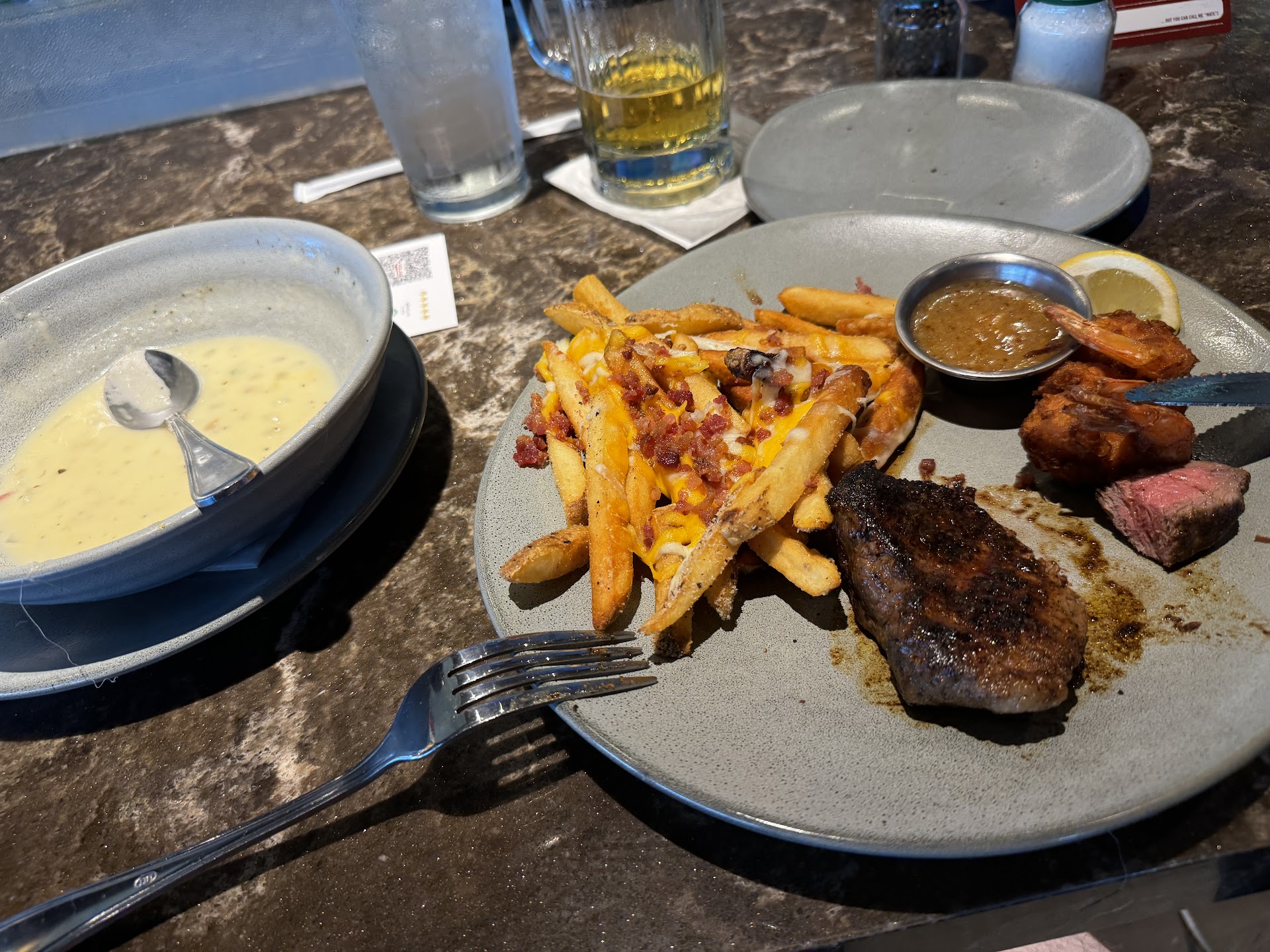 We had gotten the max and cheese bites, they weren't bad but weren't good either...the Mac and cheese filling was barely there, it was dry and overcooked and the cheese had a weird taste. We ordered steak and shrimp pasta, and steak and shrimp with mixed veggies. My steak was overcooked (asked for medium rare, got medium well on parts of it and we'll done on other parts) and it was so salty I couldn't eat but a couple bites even with the pasta. The pasta itself was also way overcooked and mush. His steak was cooked perfectly but his shrimp was severely overseasoned as well. I ordered an extra side of loaded mashed potatoes and it was just cold all the way through like they plated it first and it just sat waiting. We made no complaints since we didn't want to add more to Natasha's plate and have to wait much longer.