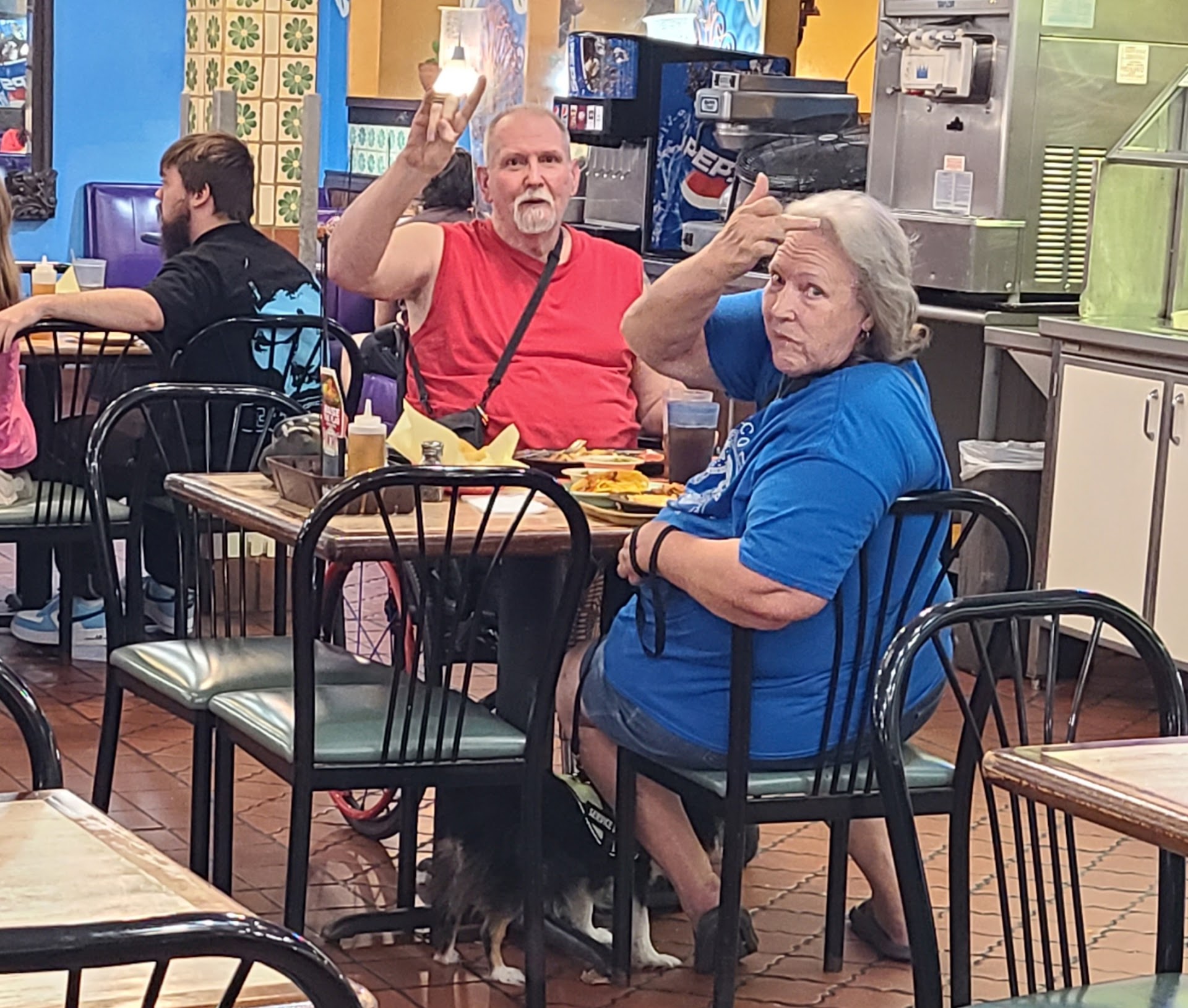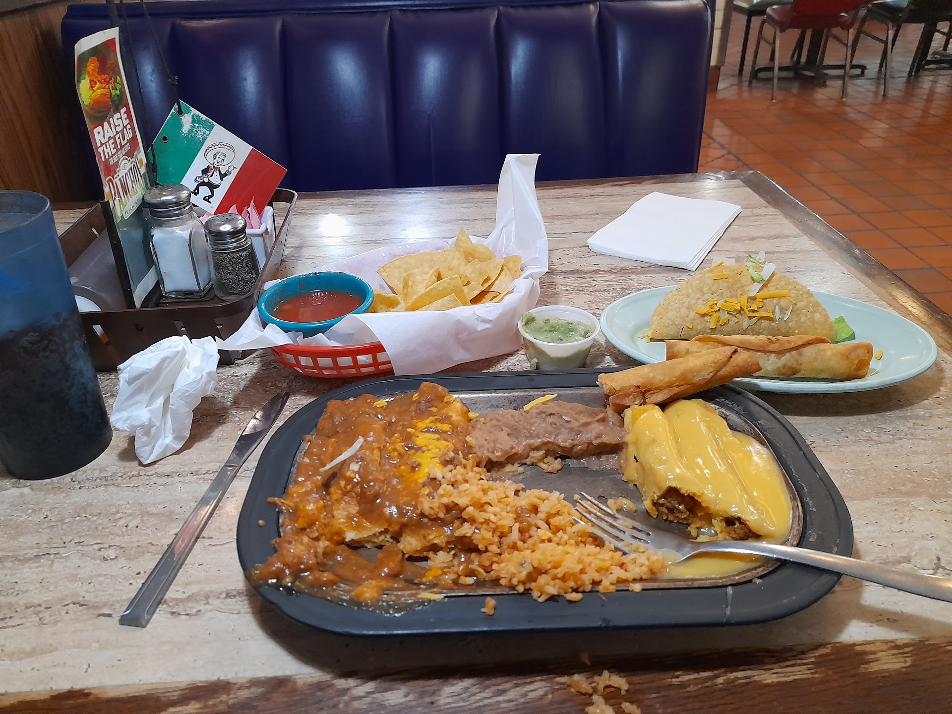 The atmosphere were typical for Panchos. There is nothing special there. The food was pretty terrible. It was Luke warm and everything was soaked in some sort of sauce. 1/2 way thru our meal, a couple walk in with a little dog sporting service animal patches. The dog was yapping and jumping up and down, which is not service animal behavior. I told the manager that it was obvious that the animal wasn't a service animal and attempted to educate him on the law. A couple nearby and 2 other couples standing in line thanked me for speaking up.