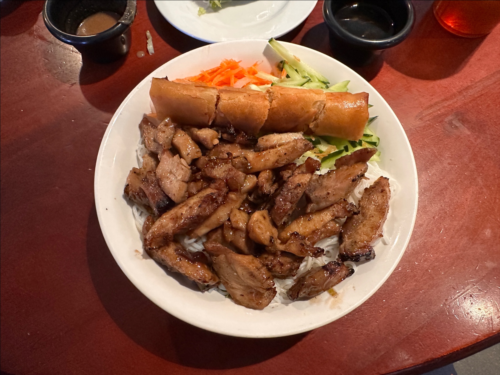 Then I did not get my pho soup, it was missed completely. The shrimp fried rice had smaller shrimp in it not tiny but not large. size of just under a quarter type, good taste. 4.2 star taste on that. Egg rolls with vermicilli; I am more used to large lettuce leafs (guam and hawaii) and limes and mint to wrap the large spring roll in. The spring rolls 4.8 star in taste, dang good, but your average size compared to the world. I would return for the egg rolls alone. But, not for the service. We sat talking for 2 hours and no one came over to deliver a to go box for the left overs until asked. The bill they didn't mention you have to go up to the register to pay, which we did. Bathroom was clean mom and pop style, but toilet was dirty.