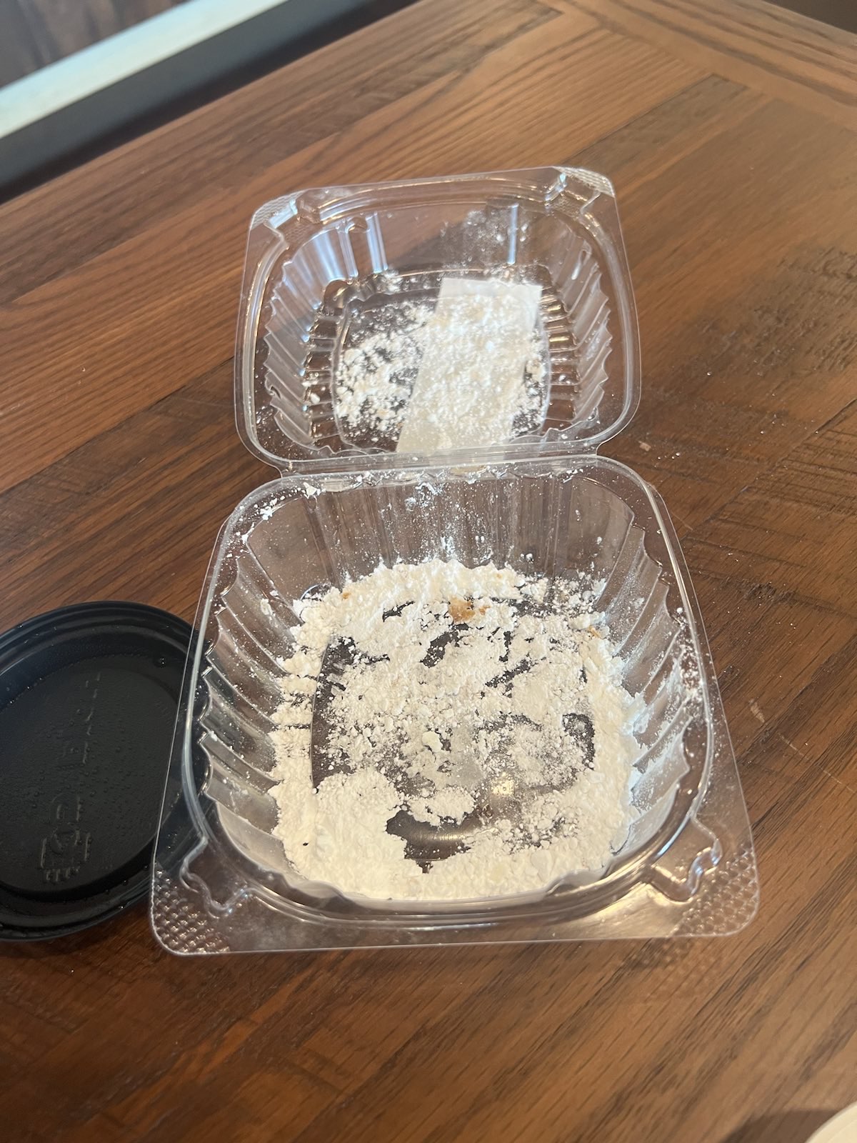 To start with I could not locate the price of beignets anywhere at all despite multiple pieces of signage so had to ask about the prices, and I was told that 3 was $5 and 6 was $10.50 (what, why would higher quantity actually cost more per pastry???) But due to this I just went ahead and ordered 3 as well as a velvet ice (which I had also gotten on my visit to the Nola location). The employees were young, and seemed nice and friendly enough, and I don't want to give them too hard of a time, but after ordering they just kind of seemed to be confused and unsure of what they were doing and sort of lost despite not having a particularly large amount of business at the time. Our order came out one item at a time and after getting the last item what I received was unlike any beignets I have ever had, as rather than being dusted with powdered sugar they were coated in thick heaps of it on all sides. There's multiple pieces of signage around the shop that should make it obvious this is not how they should look to the employees so this seemed really bizarre.