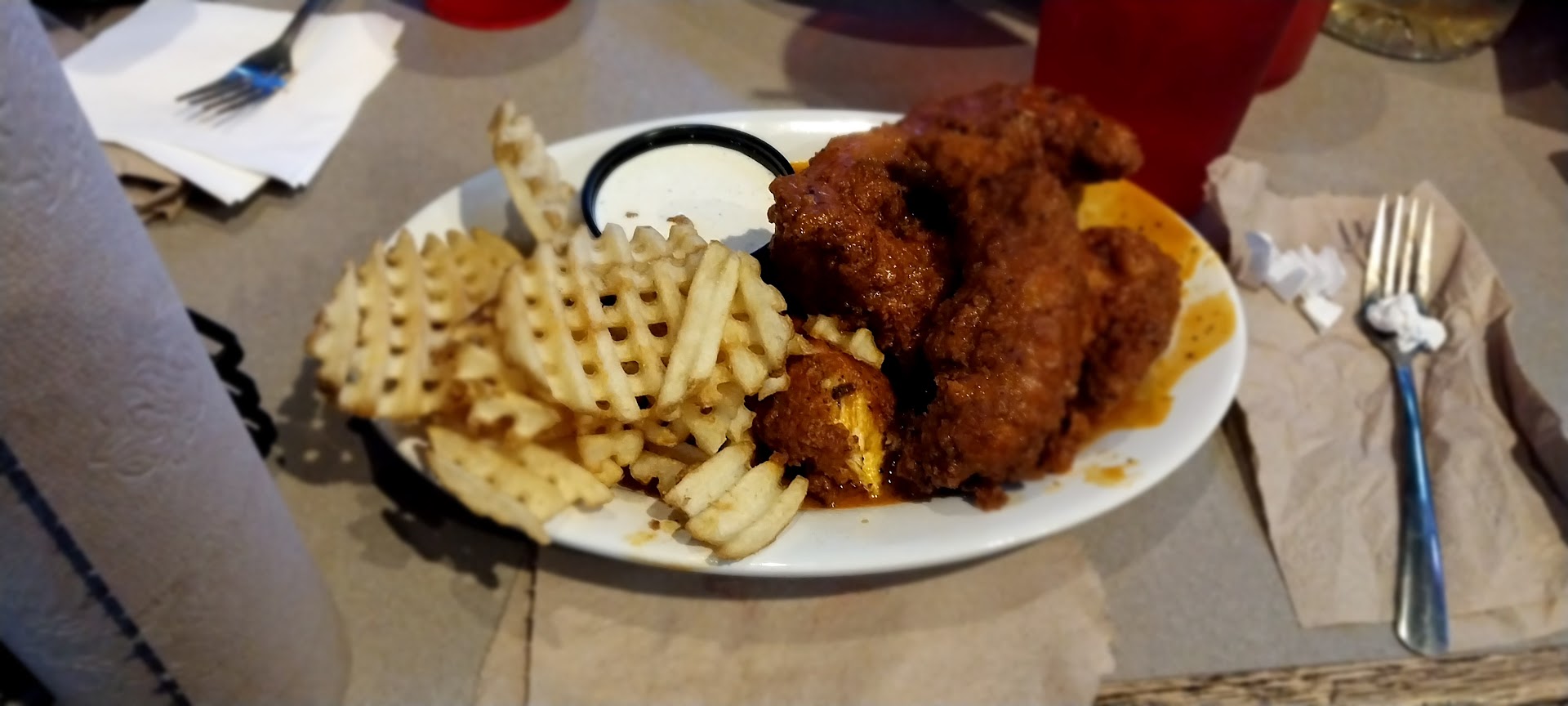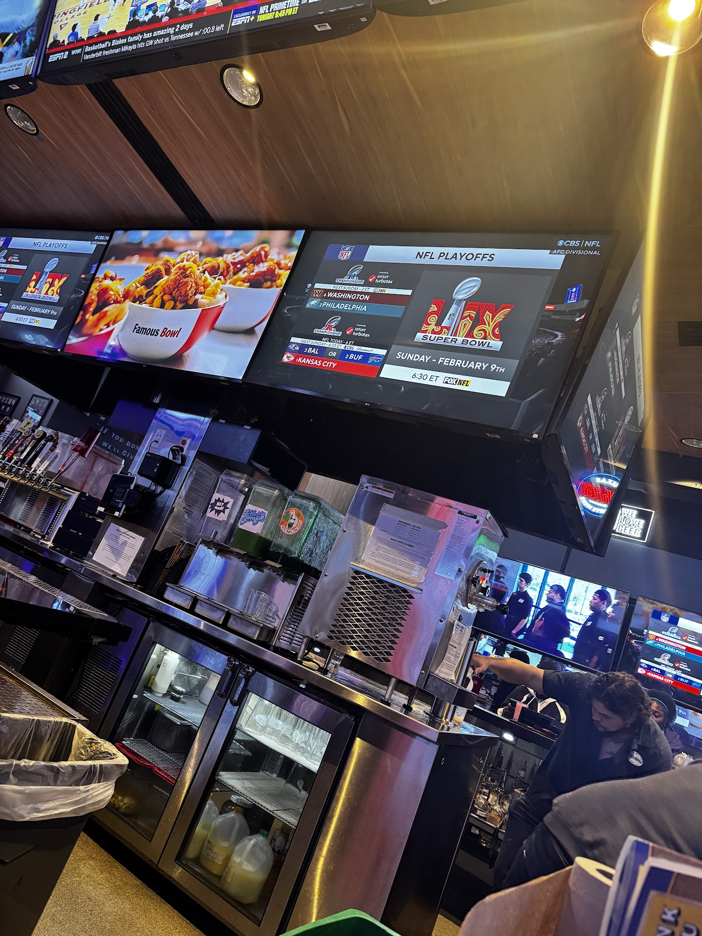 Read moreThe food was awesome! We had the appetizer sampler and loved that the fried pickles are spears instead of slices like most places. The Buffalo bites were cool and something we hadn't seen elsewhere. My wife was able to order "all flats" for her wing platter, a request often denied at other restaurants. The tenders that I got (even though I had ordered boneless wings) were juicy and tender. The atmosphere was great, too, with a popular college football game and the MLB playoffs on the TVs. The crowd was energetic but not overly boisterous, making it quite enjoyable. Service, though, left something to be desired. When being seated, we were taken to a high table even though my wife is quite short and walks with a cane. We were instead given a regular table, but that still had crumbs from the last party there. Our waitress was sweet but did not check on us very often. While our drinks were prompt, it took about 20 minutes for us to get our appetizers that were ordered with the drinks. On top of that, the "cherry Dr. Pepper" that I ordered came to us tasting of raspberry instead. It was not until the appetizers arrived that anybody came by to whom I could mention the drink issue. The lady who took care of that stated she would make me a new one but cautioned that I might need to stir it - does the bar not shake or stir mixed drinks? Even though we were there for the full halftime and 3rd quarter of the football game, as well as almost half of the 4th quarter, our waitress only checked on us twice, with the second time being at the end of our time there, with us asking for boxes for our leftovers. She asked if we were ready for the tab without an offer of dessert or anything more. Just as we finished boxing our food, she was back to collect the dishes, making us feel as though we were being rushed out even though there were still a number of tables open and no wait. Overall, not a horrible experience, but future patronage will be solely for the food and either take-out...
