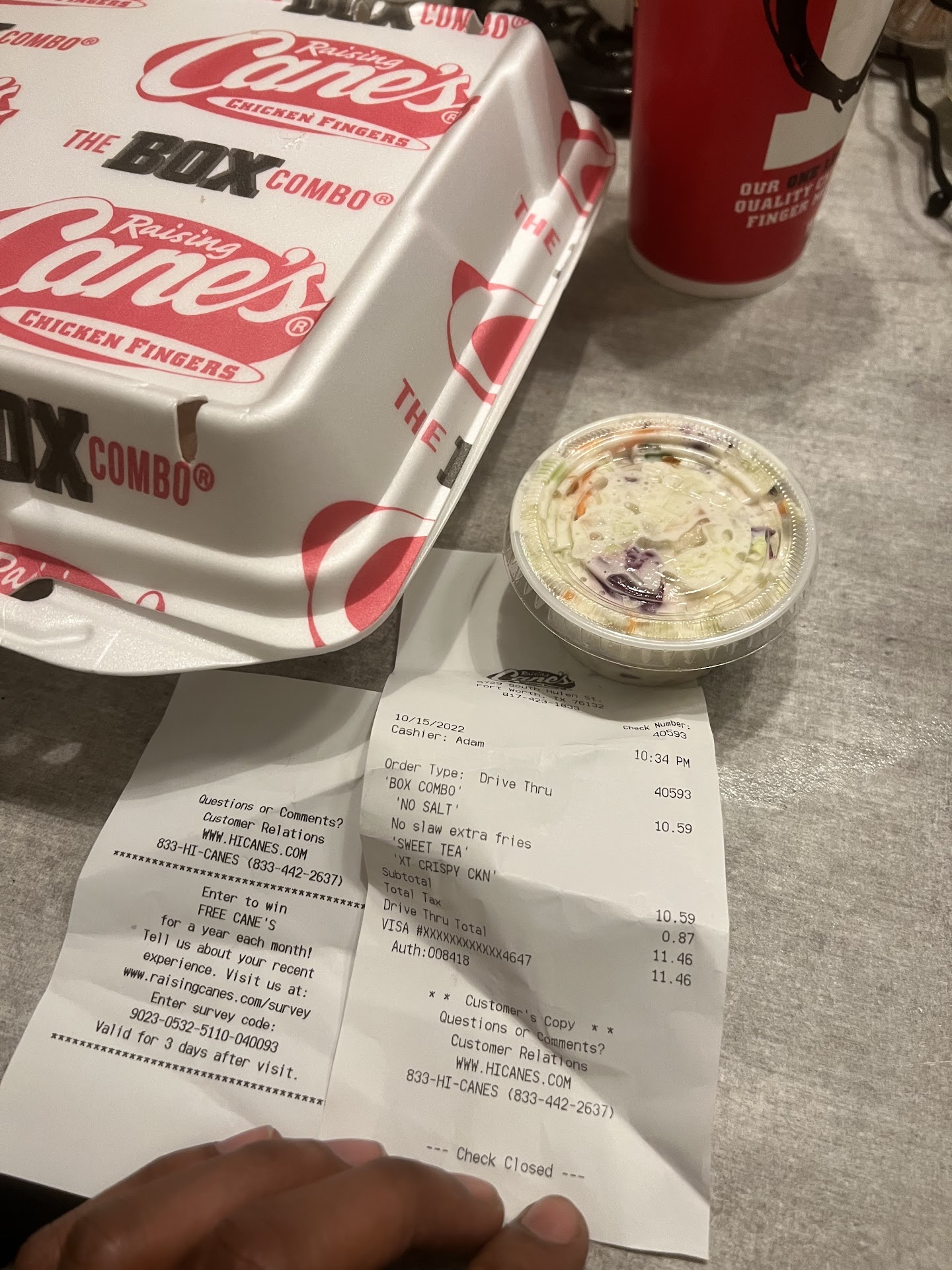 Ā Ā Ā Read moreI hate to do this on canes, but the food was absolutely terrible. Number one my one daughter and I ate leftovers last night instead of the 6 piece because the whole order was not delivered. Number 2 my other daughter that had the three piece hot sauce that looked like it was from death. This place is a treat for us. It used to be a weekly thing, but sometimes you have to stop that ha ha so we made it a treat and this absolutely was not a treat. This was horrible. The sauce looks spoiled or diluted or something, and the food was not delivered accordingly, and what we did get, did not taste, right . Iām not want to complain. You could look on my reviews. I told the GrubHub driver something and things are missing and she said oh just go ahead and call them and Iāll give you a refund and she drove off. I tried calling the restaurant itself, and no one answered. Customer service, detail, orientation, and satisfaction along with communication was not in place at all whatsoever in this transaction.. I never want to come here again and I really...