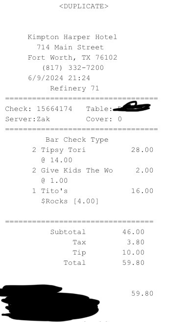 Read moreTori and Zach are the ABSOLUTE BEST!!! Every time we come into the Kimpton with a big group of parents, they are always ON TOP OF EVERYTHING!! There is absolutely nothing that they would not do for their customers. Going above and beyond to offer drinks, food, etc, whatever it may be, they accommodate. In my 7 years of living in Fort Worth there has been no other bar tenders as great as these two! Those who hate must be jealous of their hospitality! Seriously could go on and on about these two! Come to the bar!! Relax...