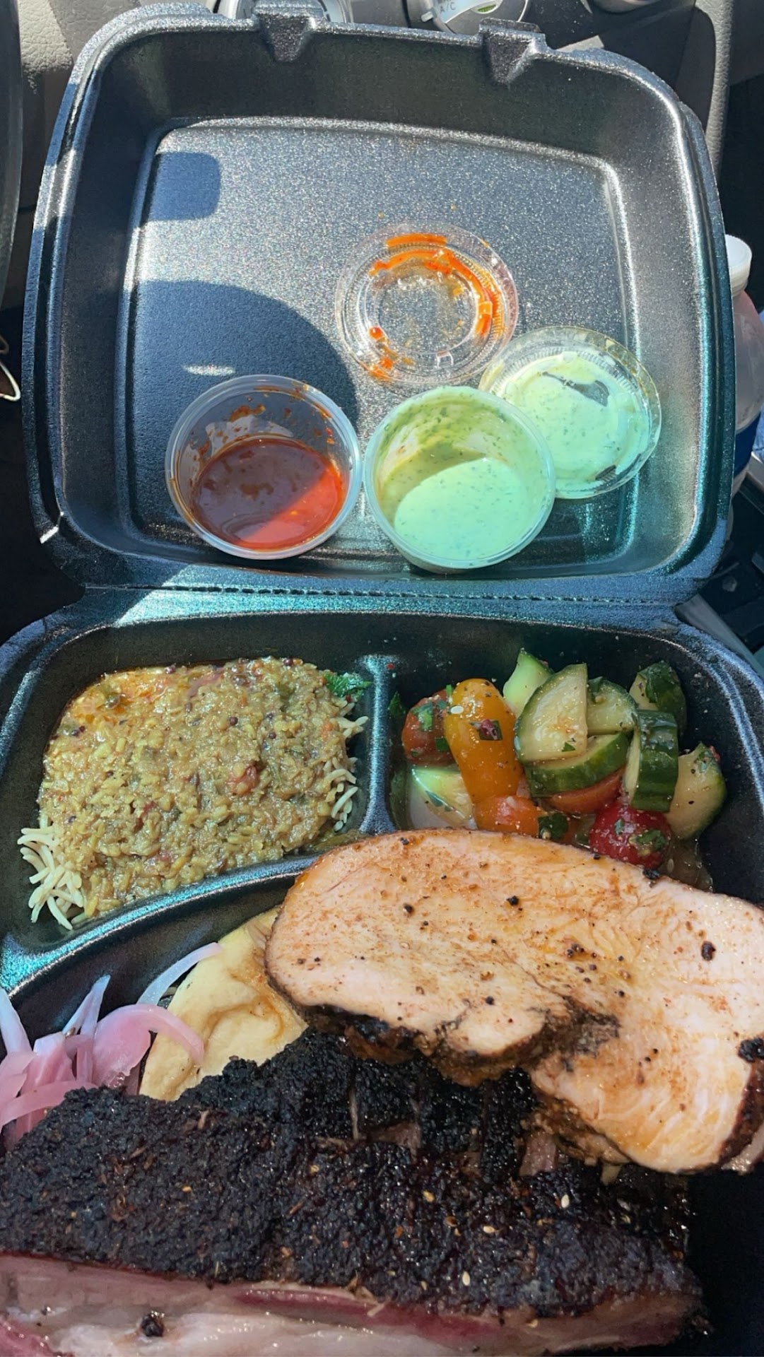 Read moreWas psyched to try this spot since I found out about it. So, I finally made the drive out to Fort Worth (from Dallas). A very unassuming establishment, a small little blue food truck. Parking was easy as it was located in a parking lot. Before ordering my meal, Zain the owner of Sabar gave me a quick rundown of the meats and sides as he was slicing away at the smoked meats in my direct line of sight! Luckily for me I was given a sample of the Brisket to try by Zain as he continued breaking down the menu for me! That Brisket sample was heavenly! So after ordering and settling down. I tried their Sichuan lamb rib which was smoky, meaty, fatty, and full of flavor! Loved the fusion of smoked meats with asian/middle eastern herbs and spices. Of course had to order some Brisket after that sample, and when I tell you that was some of the most tender, moist and flavorful brisket Iâve ever had if not the most. Last but not least ordered the Tandoori Turkey which was the most tender, flavorful, and juiciest turkey Iâve ever had at any BBQ joint or period! Didnât get a chance to try their Burnt End's Nihari as they had sold out already or their Seekh Kebab Sausage which they didnât make that week. But, I plan on trying it on my next visit here! As far as the sides they were excellent! The Daal Chawal (lentils with rice) were full of flavor and pair perfectly with the meats. Make sure you try the Kachumber salad too, for something light and refreshing (but still packed with flavor) to balance out the meal. Keep in mind each plate has a piece of naan bread hiding under the meat which is perfect because it just mops up all the meat juices! None of the meats really need any sauces but their chili crisp BBQ sauce pairs nicely with the lamb ribs and their mint cilantro Raita (yoghurt sauce) goes well with the Brisket. Lastly their sole dessert Gajrela, which is a type of pudding made from carrots, and topped with a variety of nuts, is the perfect closer to an excellent meal. My meal: 3 meats, 2...