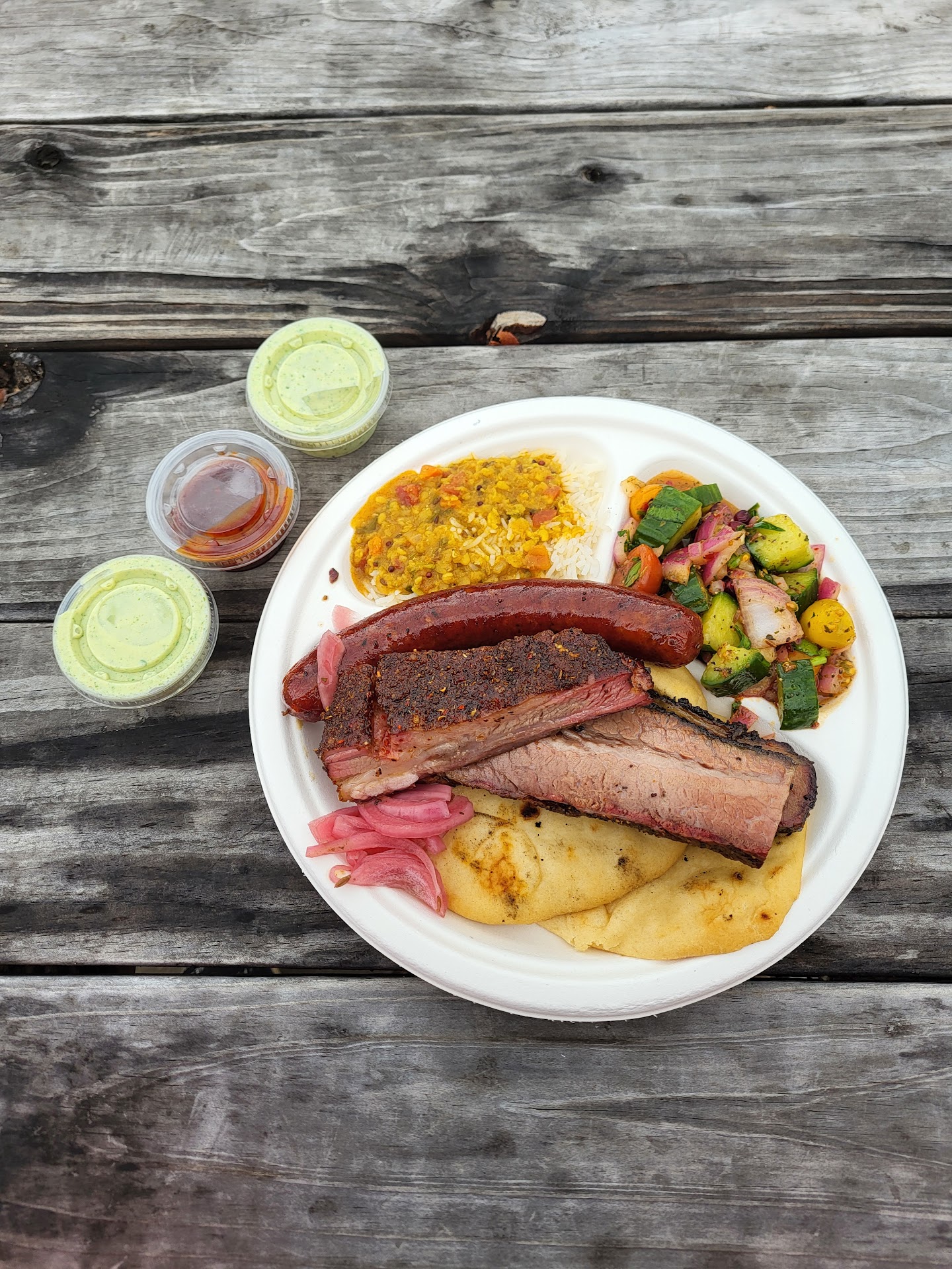 Pitmaster Zain Shafi runs this blue trailer like a flavor command center. The smell hit me halfway through the line and had me grinning like a kid at the state fair. I made my move when it was my turn, and if you know me, you know lamb is my kryptonite. I ordered the Sichuan Lamb Ribs, then couldnât stop myself from adding brisket and Tandoori Turkey. The sides? Kachumber Salad and Daal Chawaal, because even Uncle Sean needs balance in life. Zain loaded everything up, tossed it all on top of some naan for good measure, and sent me to my table like a champion headed to the winnerâs circle.