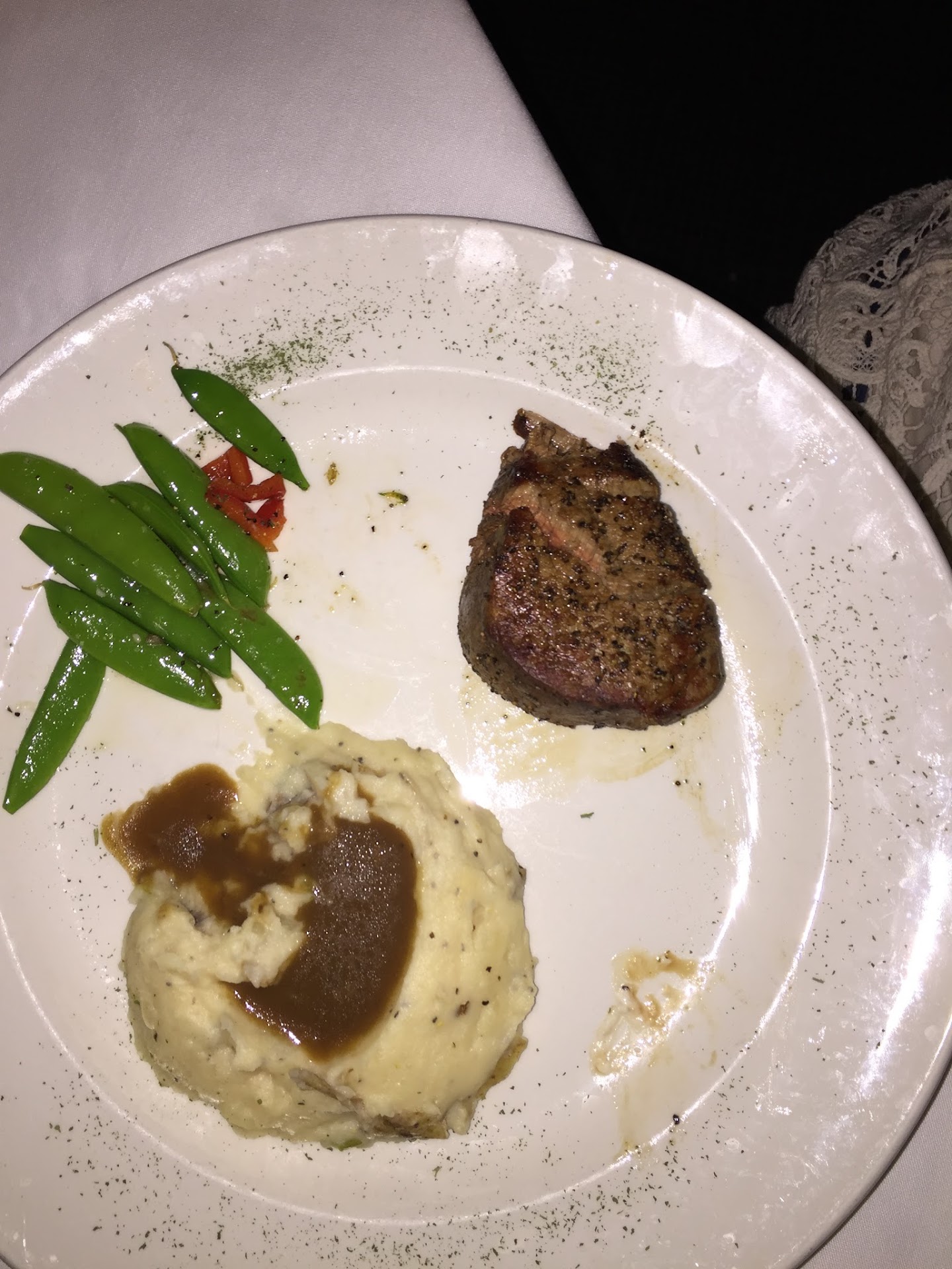 On to the entrees for the evening. She requested the Petite Filet while I ordered the smaller portion of Prime Rib. My prime rib was very good and cooked exactly to order as was her filet. She was particularly pleased with both the flavor and the tenderness of her filet. It was a small filet but she ate avery bite of it. On the other hand, my small prime rib was actually quite large and I could not finish it all. There was enough that it was well worth getting a to go box for it. My entree came with mashed potatoes and snap peas. The peas were warm, but they hadn't been cooked at all. I am a soft vegetable lover, so these were basically inedible for me. The warm gravy Gabriel served over the potatoes was excellent (and hot).