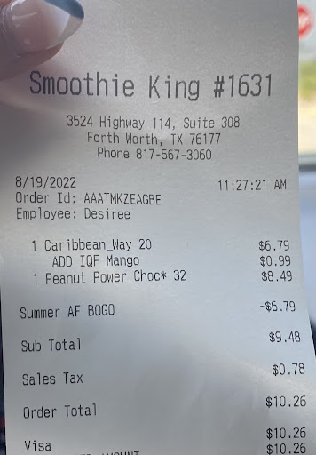 Read moreMy wife and I come here a lot for breakfast, we love the smoothies and generally the customer service is awesome. My review has nothing to do with the quality of the smoothies. I do have a problem with management. Every morning that we go to this Smoothie King, there seems to be only one person working. And quite a few customers. Drive through lines pile up, there’s people in curbside (us today) and one person is running the whole thing. As a former retail manager I can understand having fewer employees during down times, but I also understand culture and what kind of work environment you set up and a standard you set for your team. I don’t believe this store has that because although the team is giving good service(most of the time), you can see it in their face the amount of stress they are going through when you have all of these customers and they are by themselves. Today, we chose curbside pickup because we had to be at work earlier than normal and to take our infant to her doctor’s appointment in downtown Ft Worth, SM promotes “Why Wait In Line, Pick Up Curbside” (or save time, I don’t remember). After exceeding our time for pickup by 15 mins (15mins of time on I35 is priceless sometimes) my wife went inside the store to check on our smoothies. The guy working was very polite and apologetic about the delay, but also complained that “they always do this” and “I don’t know how they expect to run this store with only 1 person” and “customers always end up coming inside and complaining about the delay” and “this is my last week, I’m quitting”. In my opinion, this is not a work environment set up for success. I really hope Smoothie King addresses this because we love coming here to get breakfast, but we also like getting to work on time (or at least getting our drinks at the time their system says we will). It may sound petty of me to say all of this but we now leave our house 15-30 mins earlier than we’d normally need to, to get to work on time, because we expect delays at smoothie king. 9/10 times we experience...