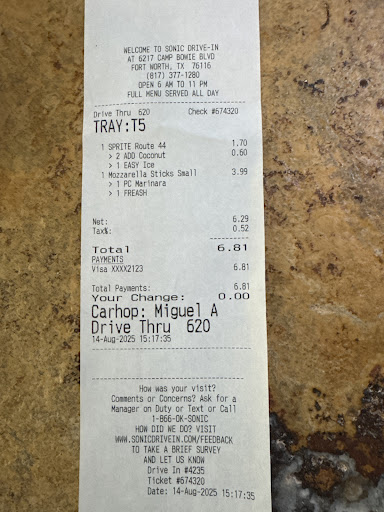 Read more8/16/24-I reached out to Sonic HQ about my poor experiences at this location. Sonic HQ Customer Service is either completely incompetent or is purposely giving me the run around so I will drop my complaint. it is all automated email responses asking me for the same details over and over with no resolution at all. It is clear that Sonic has no interest in resolving their customer service issues. There are multiple poor reviews and yet nothing changes. Instead they give customers the run around until they drop their complaint.