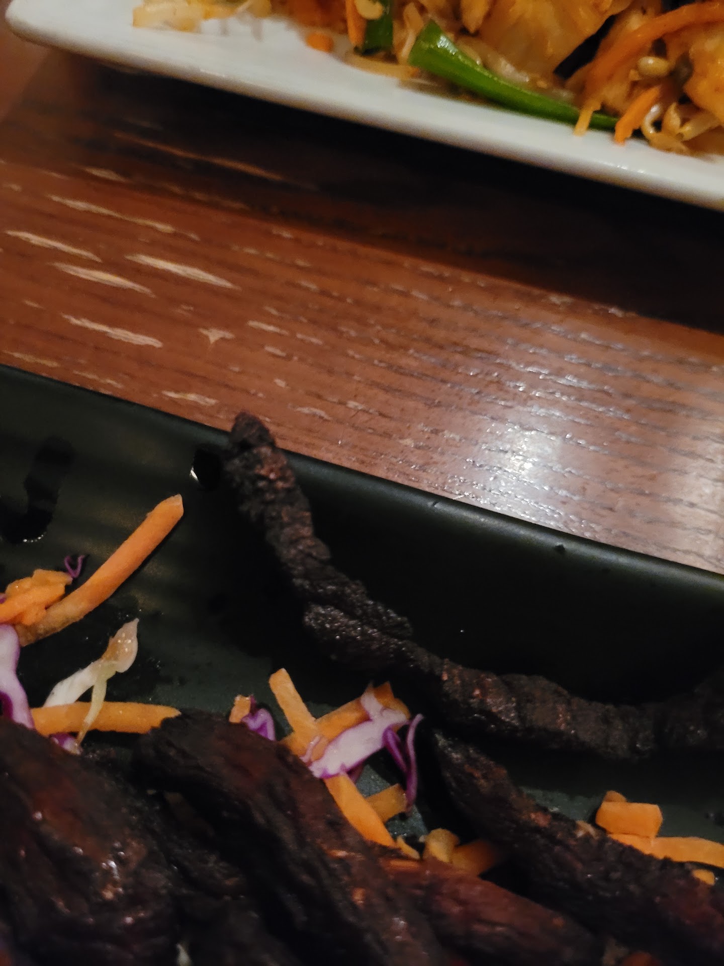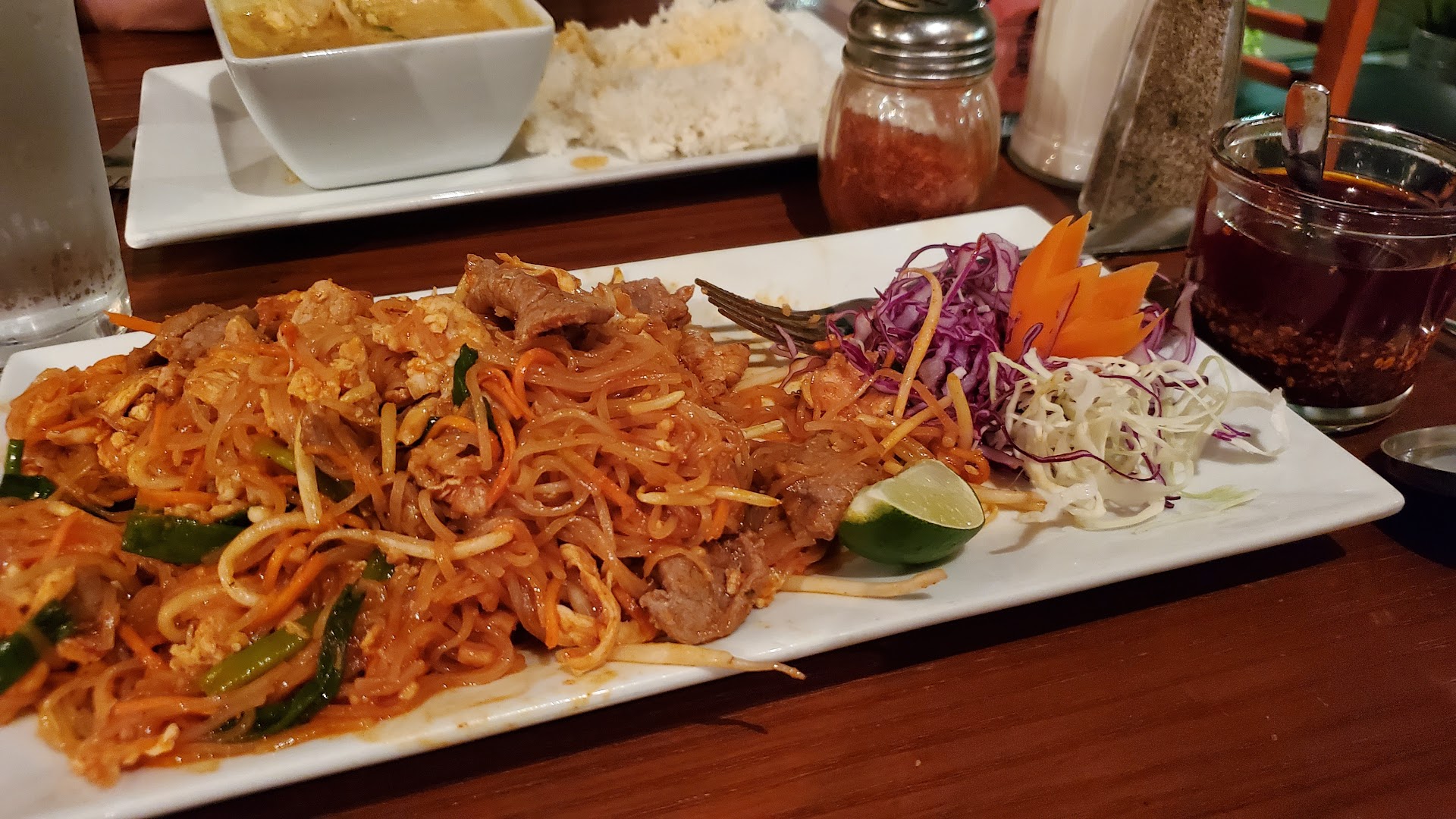 I ordered Pad Thai (I know) 3 out of 5, combo meats with extra meat. Mine was served borderline cold, and with absolutely no spiciness at all. Very bland. We actually never saw our original waitress again for the rest of the evening, and when I was able to flag someone down, they told me "we are very busy, so unless you want to wait another 45 minutes, I can bring you out some pepper oil".